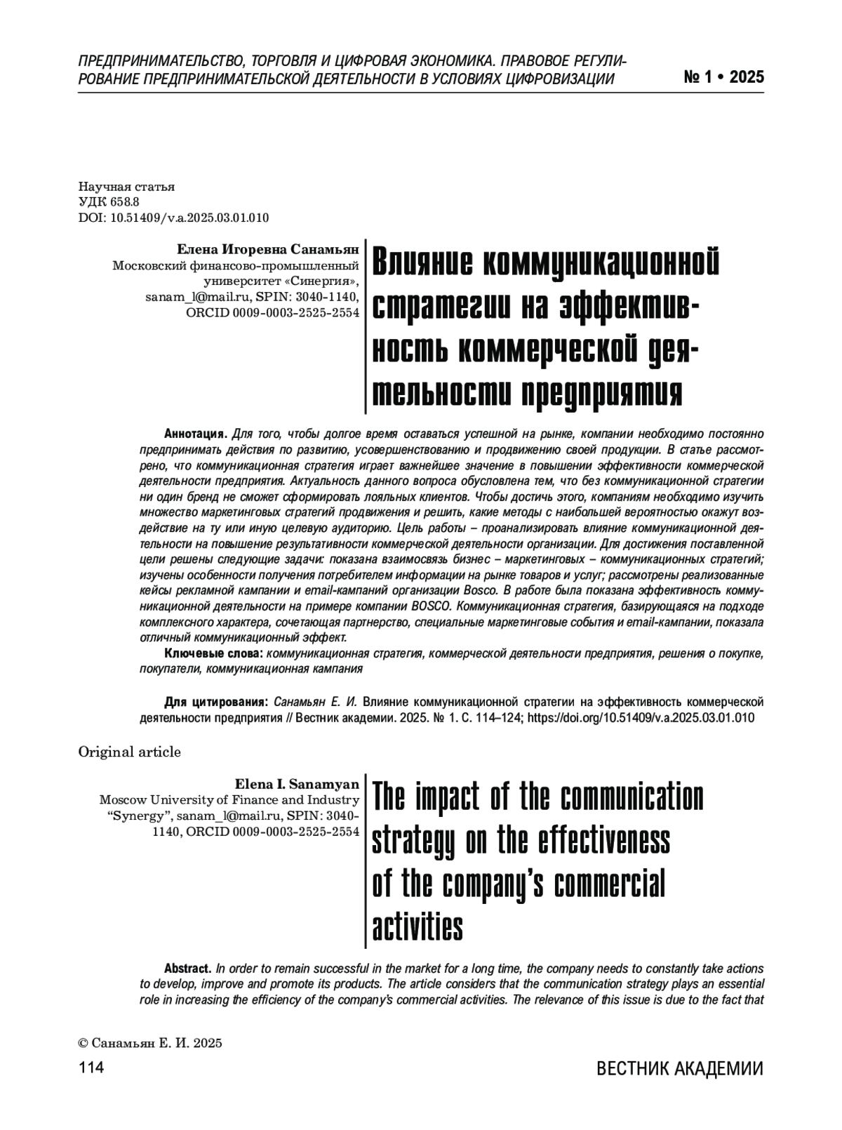Для того, чтобы долгое время оставаться успешной на рынке, компании необходимо постоянно предпринимать действия по развитию, усовершенствованию и продвижению своей продукции. В статье рассмотрено, что коммуникационная стратегия играет важнейшее значение в повышении эффективности коммерческой деятельности предприятия. Актуальность данного вопроса обусловлена тем, что без коммуникационной стратегии ни один бренд не сможет сформировать лояльных клиентов. Чтобы достичь этого, компаниям необходимо изучить множество маркетинговых стратегий продвижения и решить, какие методы с наибольшей вероятностью окажут воздействие на ту или иную целевую аудиторию. Цель работы – проанализировать влияние коммуникационной деятельности на повышение результативности коммерческой деятельности организации. Для достижения поставленной цели решены следующие задачи: показана взаимосвязь бизнес – маркетинговых – коммуникационных стратегий; изучены особенности получения потребителем информации на рынке товаров и услуг; рассмотрены реализованные кейсы рекламной кампании и email-кампаний организации Bosco. В работе была показана эффективность коммуникационной деятельности на примере компании BOSCO. Коммуникационная стратегия, базирующаяся на подходе комплексного характера, сочетающая партнерство, специальные маркетинговые события и email-кампании, показала отличный коммуникационный эффект.