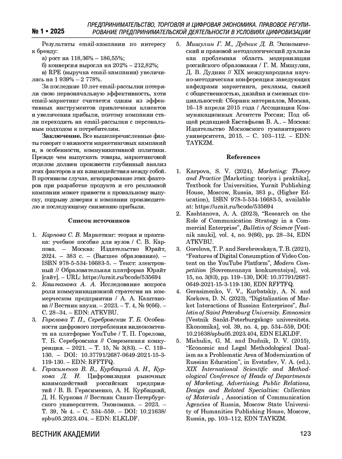 2. Каштанова А. А. Исследование вопроса роли коммуникационной стратегии на коммерческом предприятии / А. А. Каштанова // Вестник науки. - 2023. - Т. 4, № 9(66). - С. 28-34. -.
