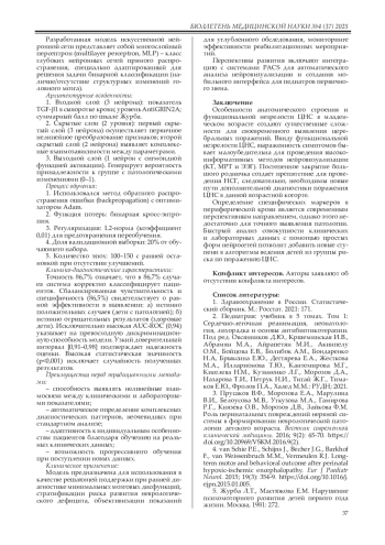 Результаты. В структуру обучаемой нейронной сети были включены 3 входных нейрона, отражающие уровень значимых параметров: трансформирующего ростового фактора бета β1, антител в сыворотке крови к белку NR2 и сумму баллов по шкале Л. Т. Журба и соавторов. Полученная нейросеть обладает высокой чувствительностью и специфичностью, точность прогнозирования составляет 86,7%. Заключение. Технология нейросетевого анализа данных, основанная на пополняемой базе данных, представляется удобным решением для практического здравоохранения и позволяет быстро и эффективно выявить группу риска поражений ЦНС в раннем возрасте.