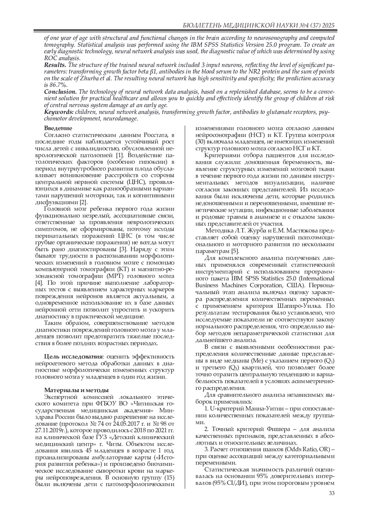 Материалы и методы. В исследование включено 45 доношенных детей одного года жизни. Дети были разделены на 2 группы: 1 группа – дети одного года жизни без структурно-функциональных изменений головного мозга, 2 группа – дети одного года жизни со структурно-функциональными изменениями головного мозга по данным нейросонографии и компьютерной томографии. Статистический анализ проведен с помощью программы «IBM SPSS Statistics Version 25.0». Для создания технологии ранней диагностики был использован нейросетевой анализ, диагностическая ценность которого определялась путем применения ROC-анализа.