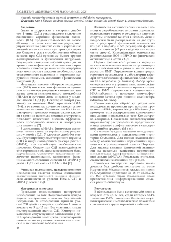 Цель. Оценить влияние регулярной физической активности на уровень гликированного гемоглобина (HbA1c), инсулиноподобного фактора роста-1 (ИФР-1) и соматотропного гормона (СТГ) у детей с сахарным диабетом 1 типа (СД1).