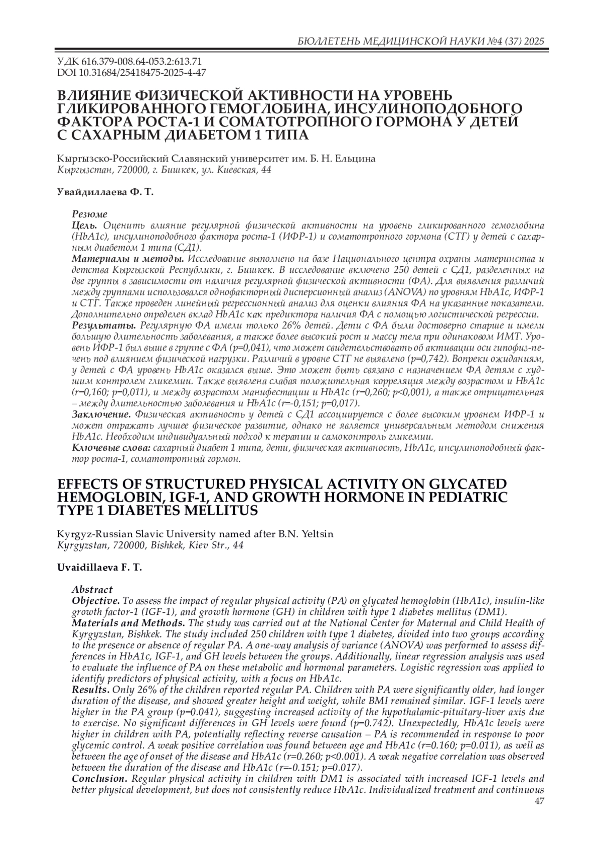 Материалы и методы. Исследование выполнено на базе Национального центра охраны материнства и детства Кыргызской Республики, г. Бишкек. В исследование включено 250 детей с СД1, разделенных на две группы в зависимости от наличия регулярной физической активности (ФА). Для выявления различий между группами использовался однофакторный дисперсионный анализ (ANOVA) по уровням HbA1c, ИФР-1 и СТГ. Также проведен линейный регрессионный анализ для оценки влияния ФА на указанные показатели. Дополнительно определен вклад HbA1c как предиктора наличия ФА с помощью логистической регрессии.