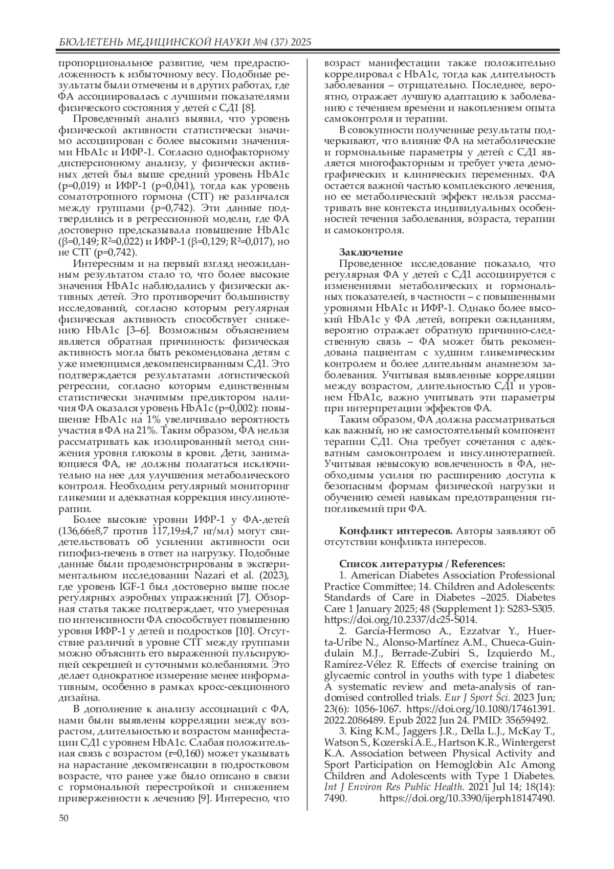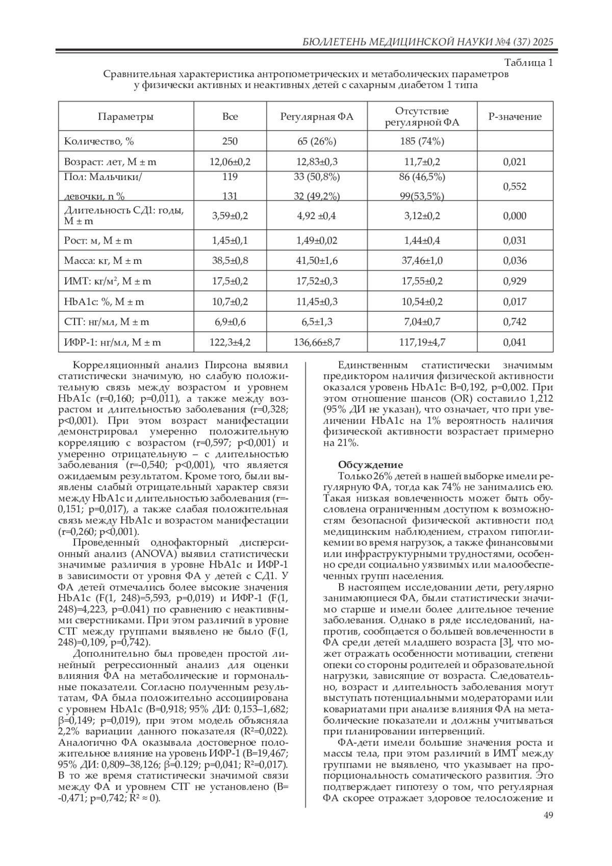 Заключение. Физическая активность у детей с СД1 ассоциируется с более высоким уровнем ИФР-1 и может отражать лучшее физическое развитие, однако не является универсальным методом снижения HbA1c. Необходим индивидуальный подход к терапии и самоконтроль гликемии.