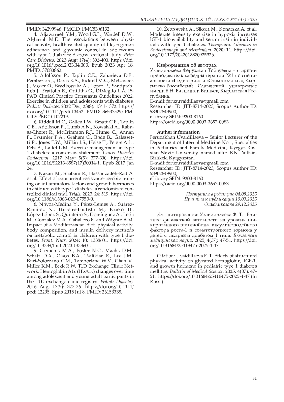 7. Nazari M., Shabani R., Hassanzadeh-Rad A. et al. Effect of concurrent resistance-aerobic training on inflammatory factors and growth hormones in children with type 1 diabetes: a randomized controlled clinical trial. Trials. 2023; 24: 519. DOI: 10.1186/s13063-023-07553-0