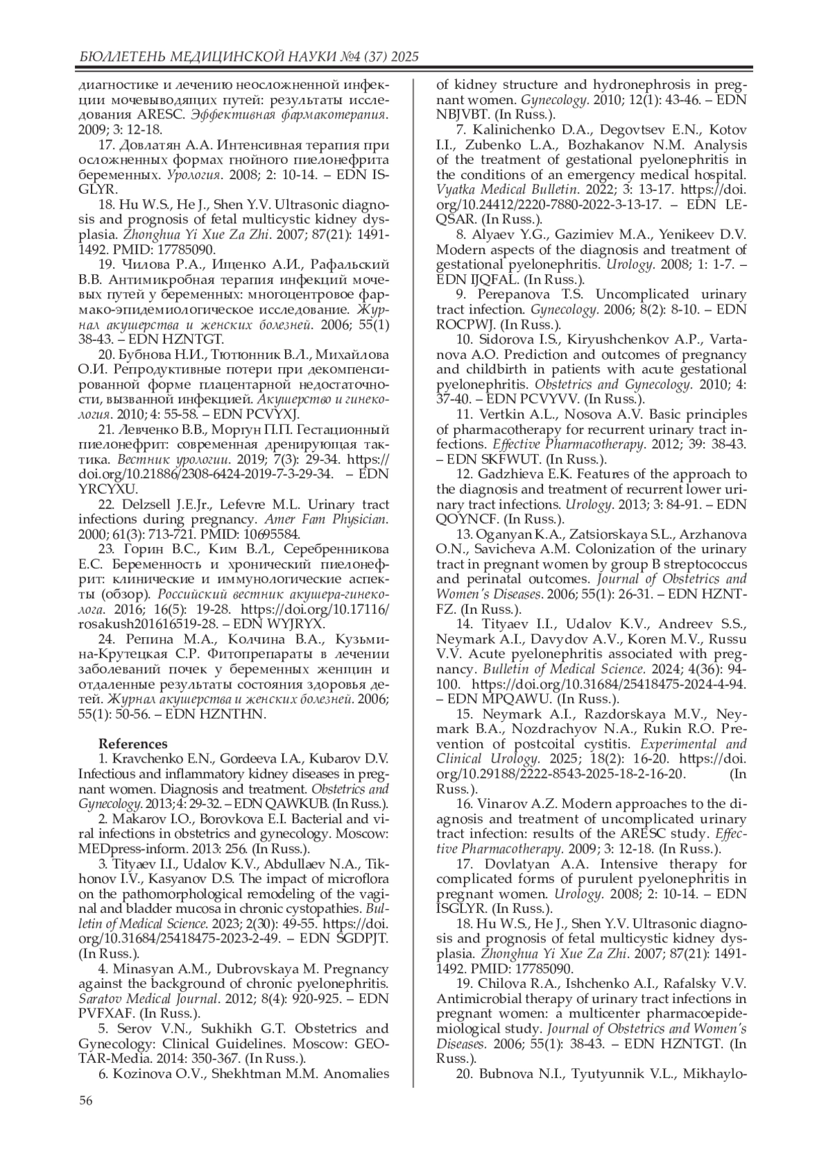 19. Чилова Р.А., Ищенко А.И., Рафальский В.В. Антимикробная терапия инфекций мочевых путей у беременных: многоцентровое фармако-эпидемиологическое исследование. Журнал акушерства и женских болезней. 2006; 55(1) 38-43.