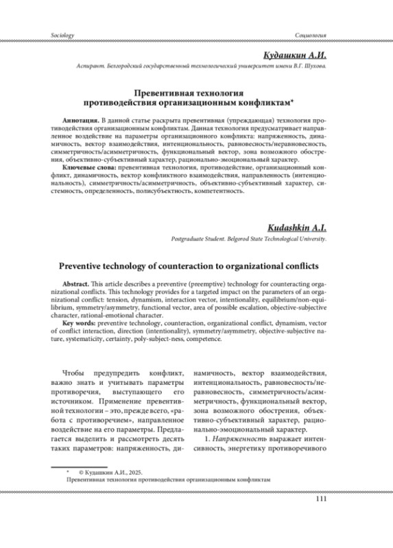 В данной статье раскрыта превентивная (упреждающая) технология противодействия организационным конфликтам. Данная технология предусматривает направленное воздействие на параметры организационного конфликта: напряженность, динамичность, вектор взаимодействия, интенциональность, равновесность/неравновесность, симметричность/асимметричность, функциональный вектор, зона возможного обострения, объективно-субъективный характер, рационально-эмоциональный характер.