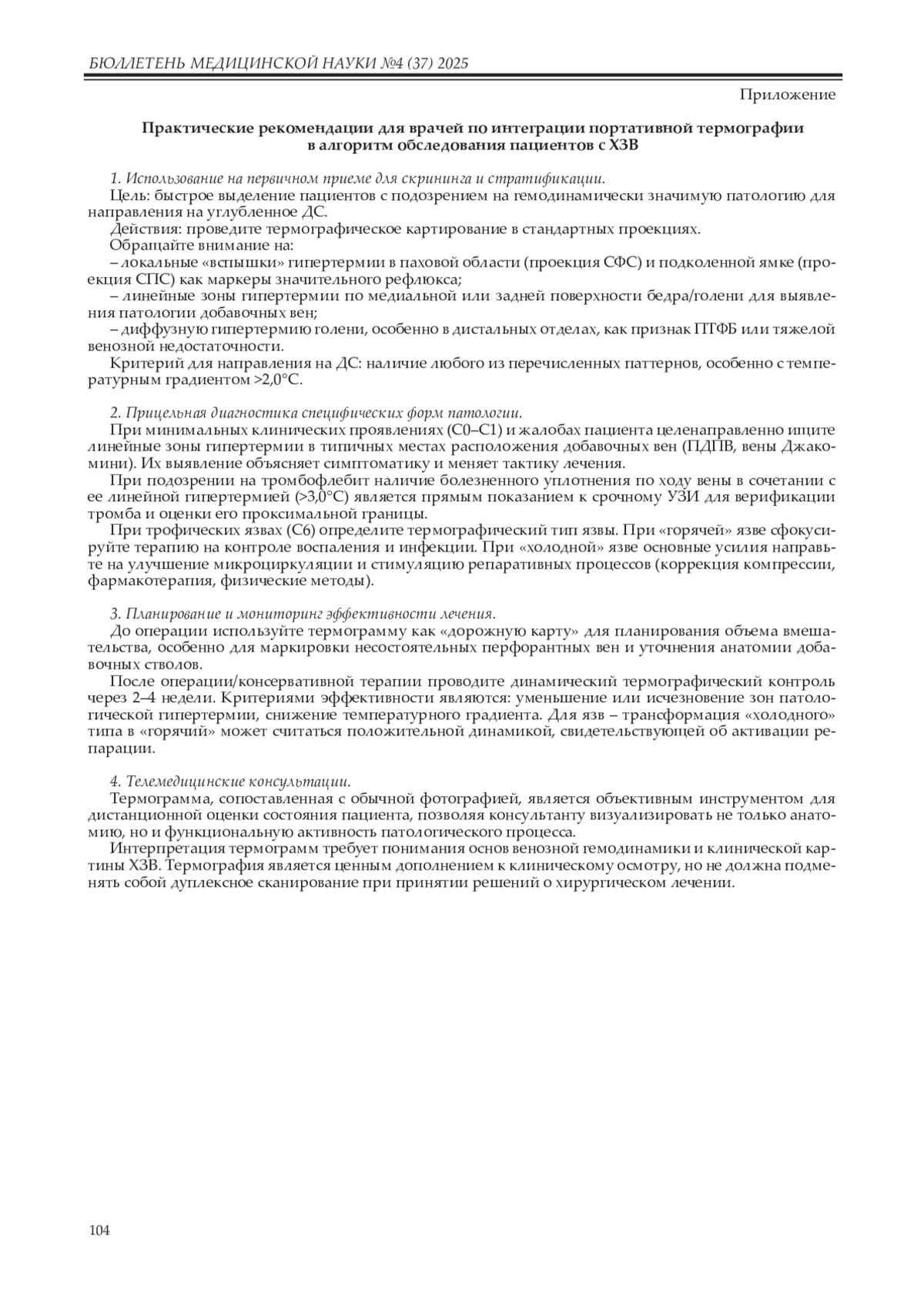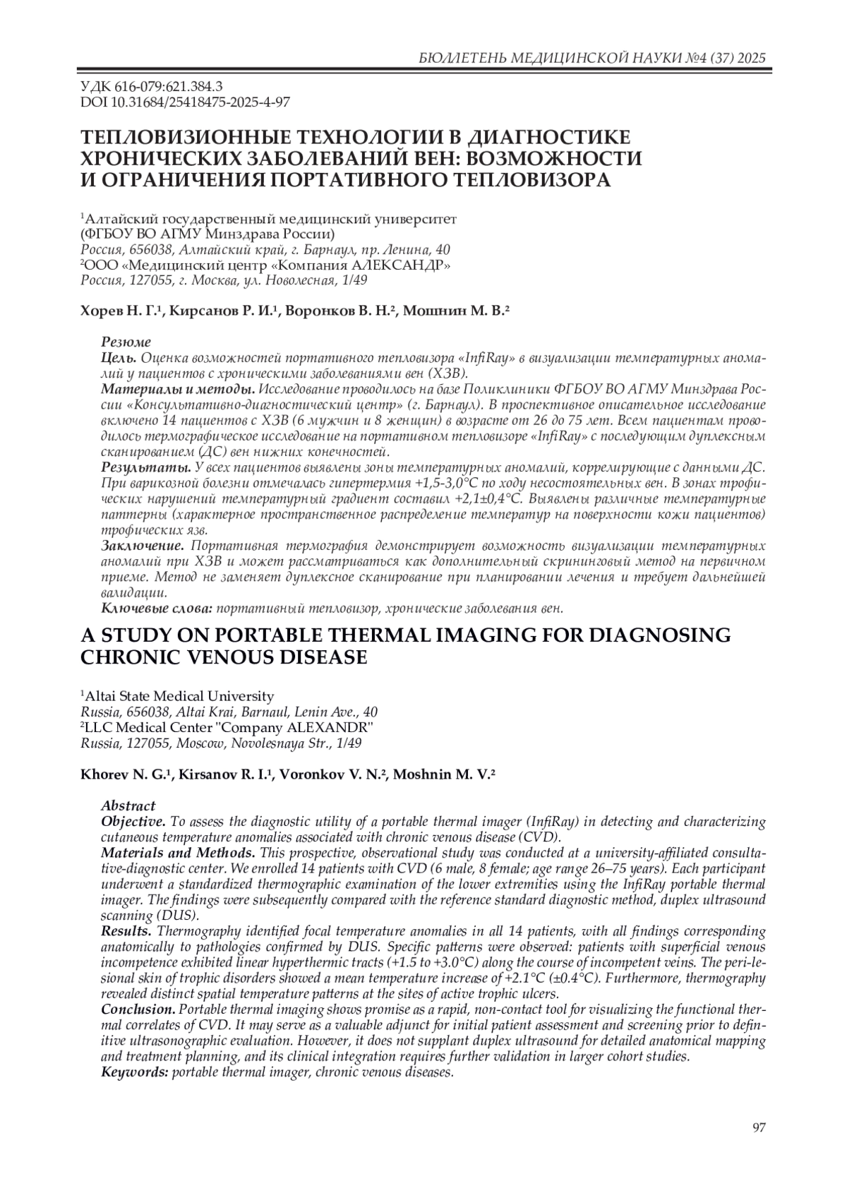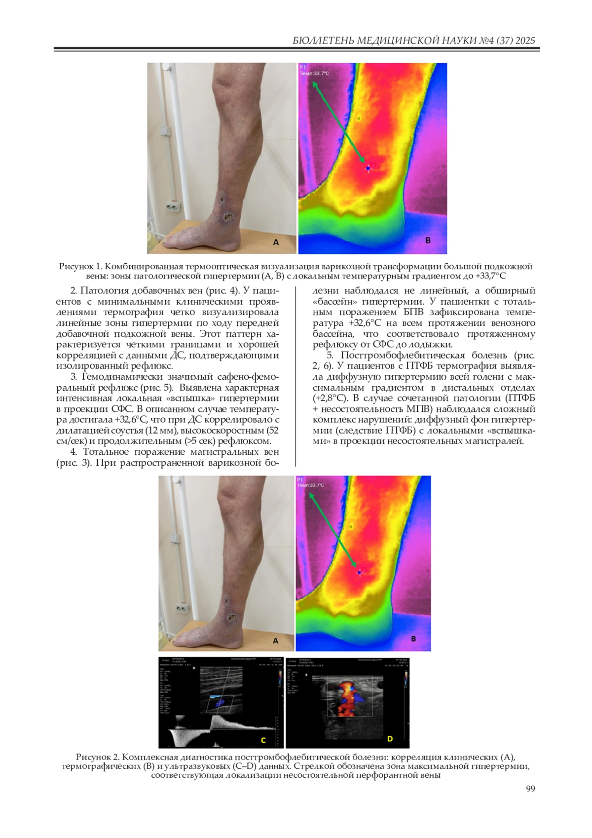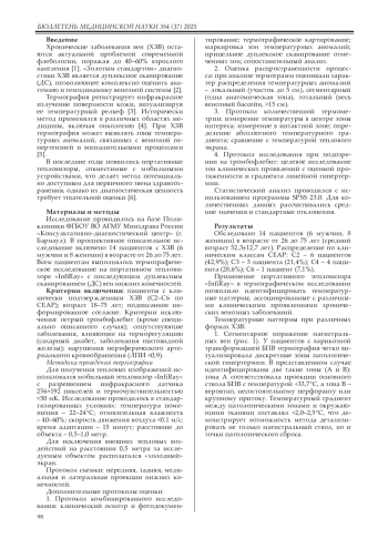 Заключение. Портативная термография демонстрирует возможность визуализации температурных аномалий при ХЗВ и может рассматриваться как дополнительный скрининговый метод на первичном приеме. Метод не заменяет дуплексное сканирование при планировании лечения и требует дальнейшей валидации.