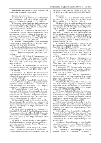 9. Salih M., Salih S., Turner B.R.H., Onida S., Davies A.H. Thermal imaging as a diagnostic tool for superficial venous insufficiency - a systematic review. Phlebology. 2025 May; 40(4): 223-227. DOI: 10.1177/02683555241301194 EDN: OLHBIL