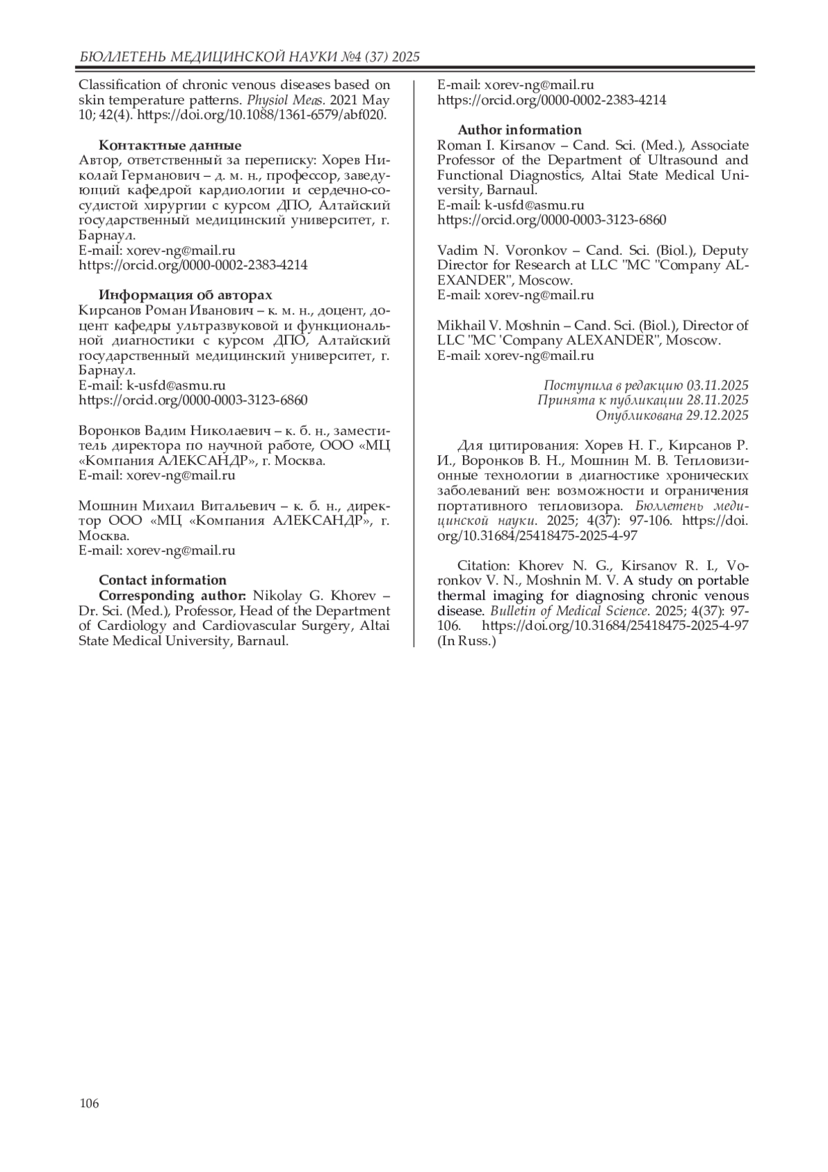12. Dávalos M.P.A., Brioschi M.L., da Rosa S.E., Brioschi G.C., Neves E.B. Can Dual Infrared-Visual Thermography Provide a More Reliable Diagnosis of Perforator Veins and Reflux Severity? J Clin Med. 2023 Nov 14; 12(22): 7085. DOI: 10.3390/jcm12227085 EDN: HWSDMV