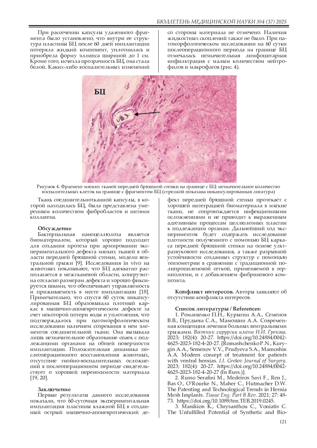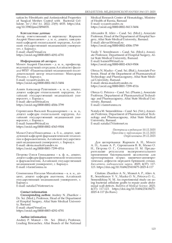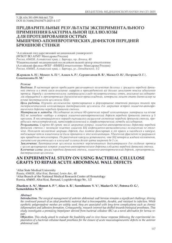 13. Zharikov A.N., Lubyansky V.G., Gladysheva E.K., Skiba E.A., Budaeva V.V., Semyonova E.N., Zharikov A.A., Sakovich G.V. Early morphological changes in tissues when replacing abdominal wall defects by bacterial nanocellulose in experimental trials. J Mater Sci Mater Med. 2018; 29(7): 95. DOI: 10.1007/s10856-018-6111-z