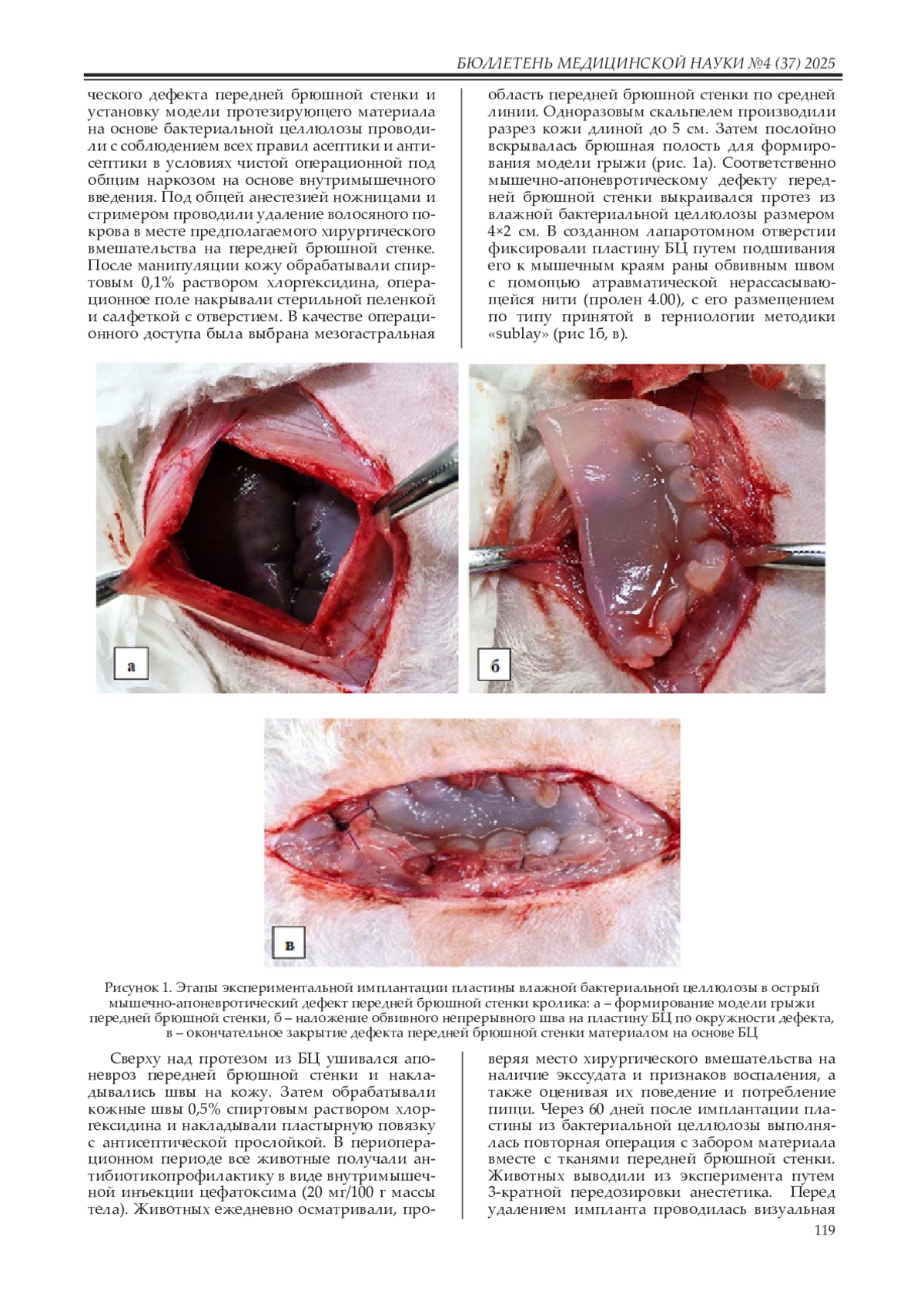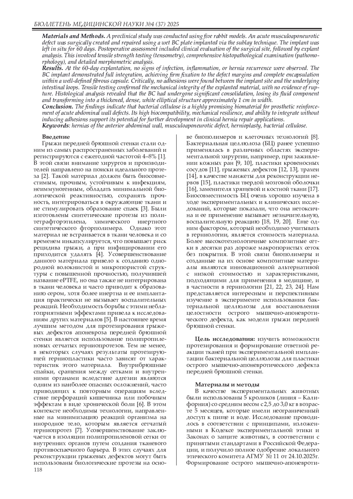 Материалы и методы. Исследование включало 60-суточный период имплантации материала на основе БЦ по методике «sublay» в острый мышечно-апоневротический дефект передней брюшной стенки у 5 кроликов. В послеоперационном периоде оценивалось визуальное состояние передней брюшной стенки, проводились тензометрический, патоморфологический и морфометрический методы исследования.