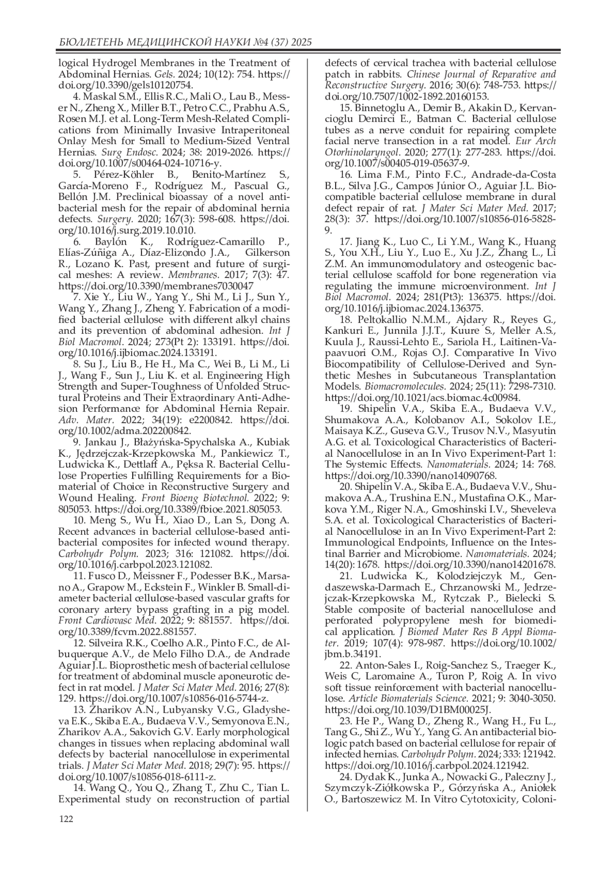 24. Dydak K., Junka A., Nowacki G., Paleczny J., Szymczyk-Ziółkowska P., Górzyńska A., Aniołek O., Bartoszewicz M. In Vitro Cytotoxicity, Colonisation by Fibroblasts and Antimicrobial Properties of Surgical Meshes Coated with Bacterial Cellulose. Int J Mol Sci. 2022; 23(9): 4835.