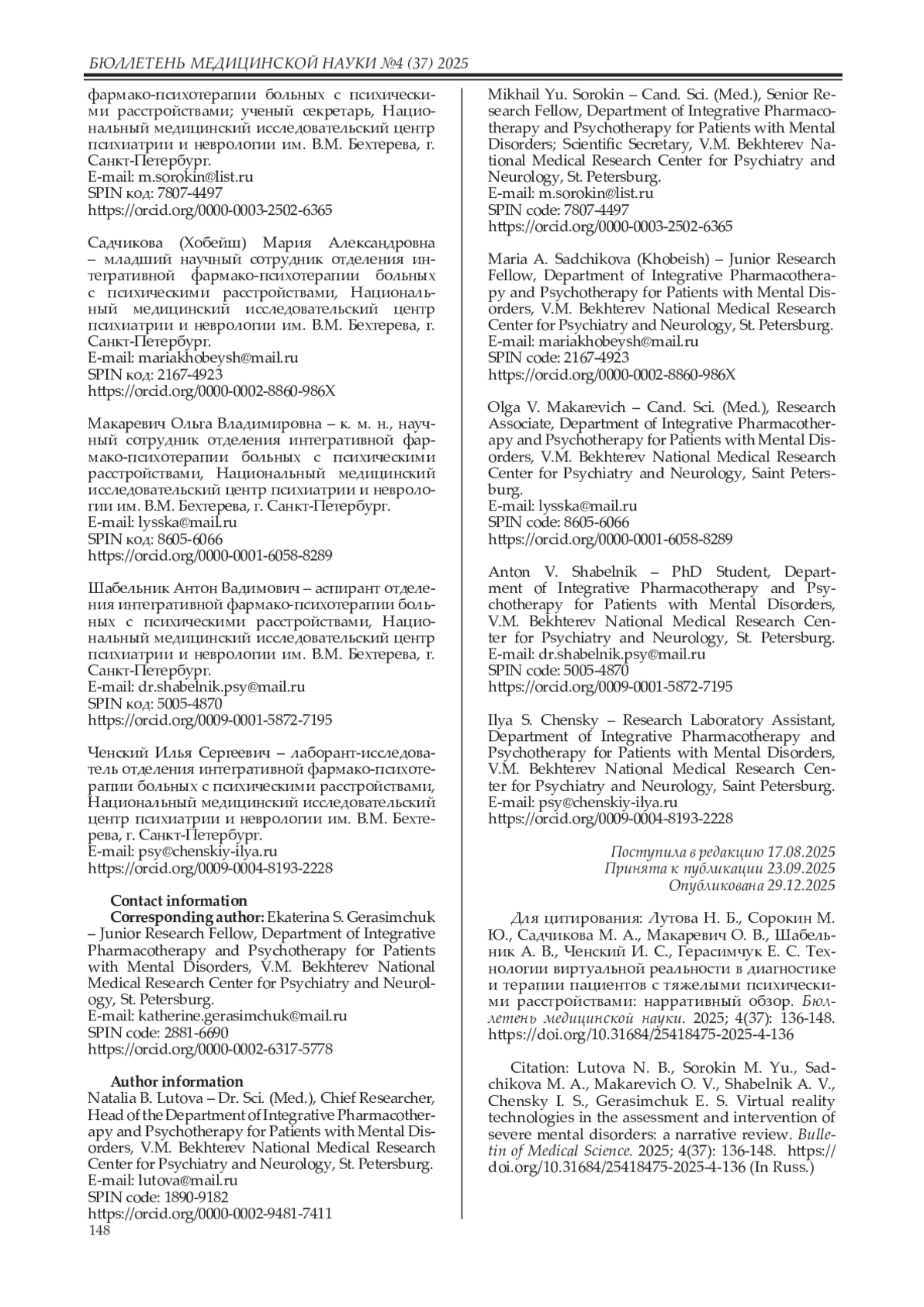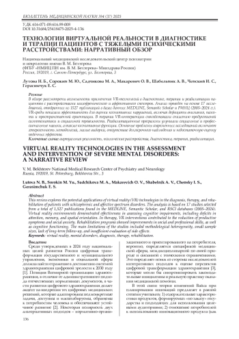 27. Шабельник А.В., Лутова Н.Б., Хобейш М.А., Макаревич О.В., Герасимчук Е.С., Сорокин М.Ю. Программно-аппаратные комплексы с виртуальной реальностью для диагностики в психиатрии: применимость по результатам пилотного исследования. Междисциплинарный журнал психиатрии и аддиктологии (Узб.). 2025; 1(1): 119-124.