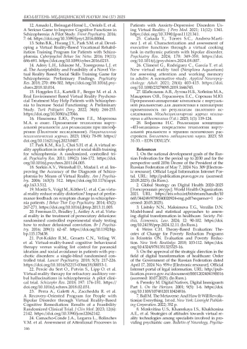 8. Москвитина У.С., Хамская И.С., Хахонина А.Е. и соавт. Стратегии отношения к технологиям виртуальной реальности специалистов, участвующих в оказании психиатрической помощи. Вестник неврологии, психиатрии и нейрохирургии. 2024; 17 № 11(178): 1271-1281. DOI: 10.33920/med-01-2411-01
