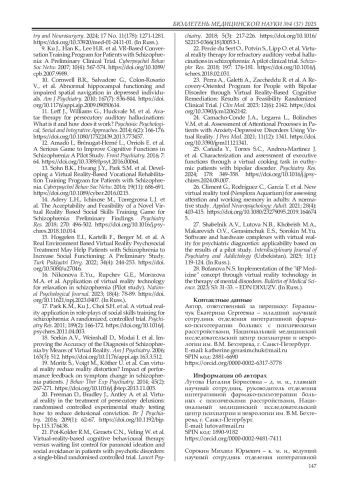14. Adery L.H., Ichinose M., Torregrossa L.J. et al. The Acceptability and Feasibility of a Novel Virtual Reality Based Social Skills Training Game for Schizophrenia: Preliminary Findings. Psychiatry Res. 2018; 270: 496-502. DOI: 10.1016/j.psychres.2018.10.014