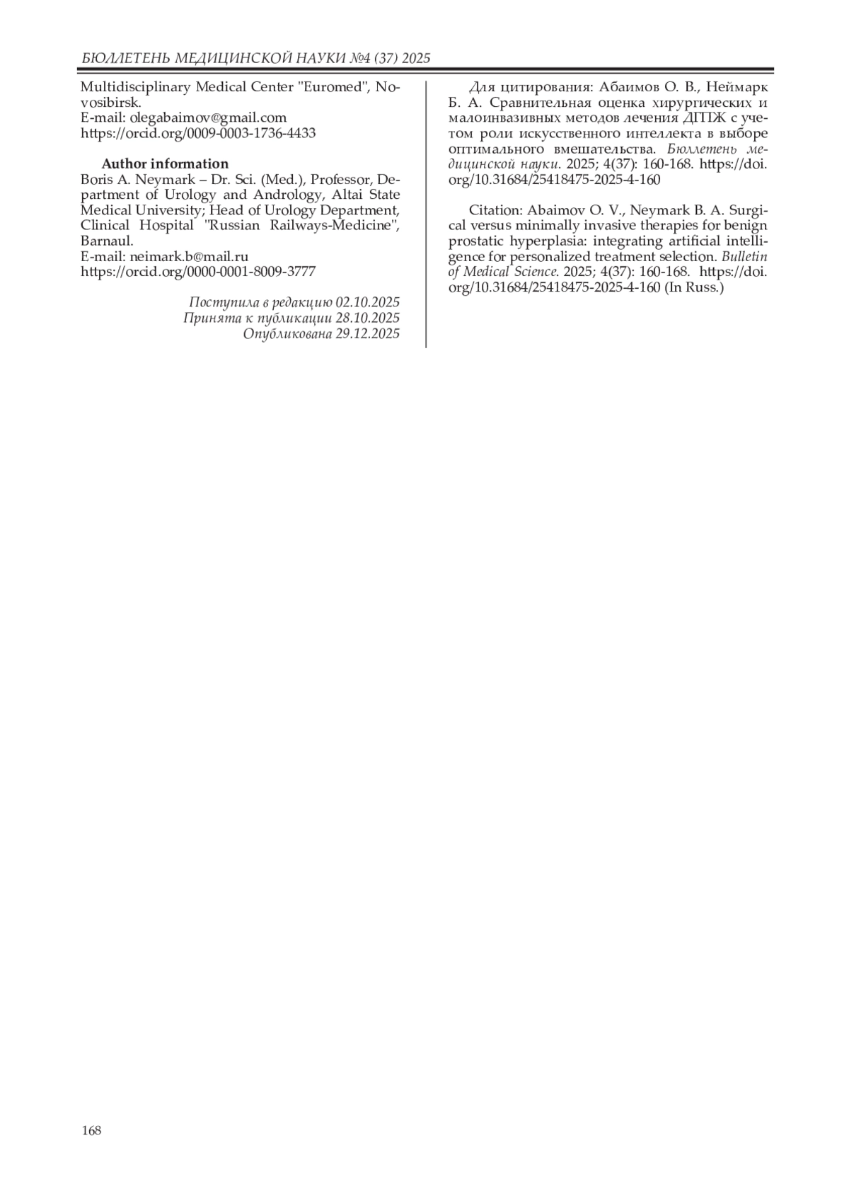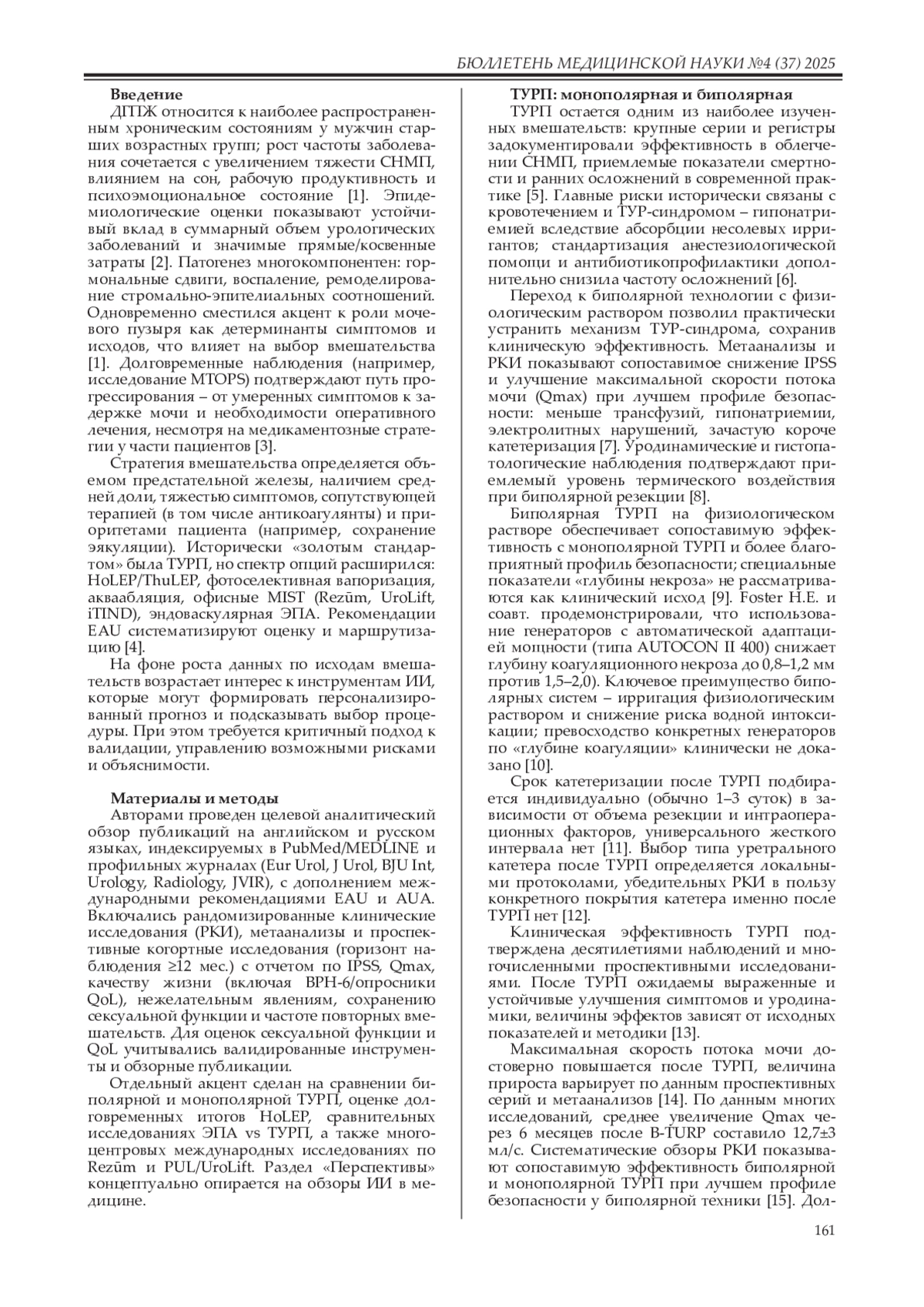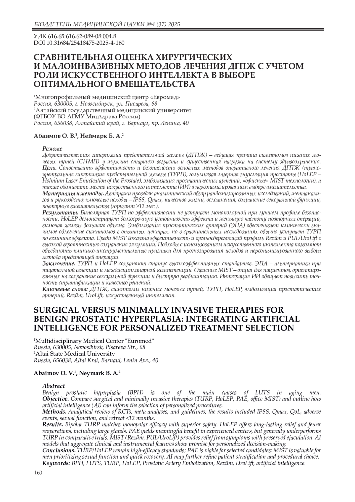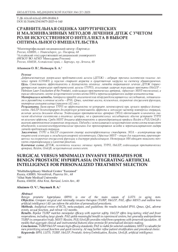Заключение. ТУРП и HoLEP сохраняют статус высокоэффективных стандартов. ЭПА – альтернатива при тщательной селекции и междисциплинарной компетенции. Офисные MIST – опция для пациентов, ориентированных на сохранение сексуальной функции и быструю реабилитацию. Интеграция ИИ обещает повысить точность стратификации и качество решений.