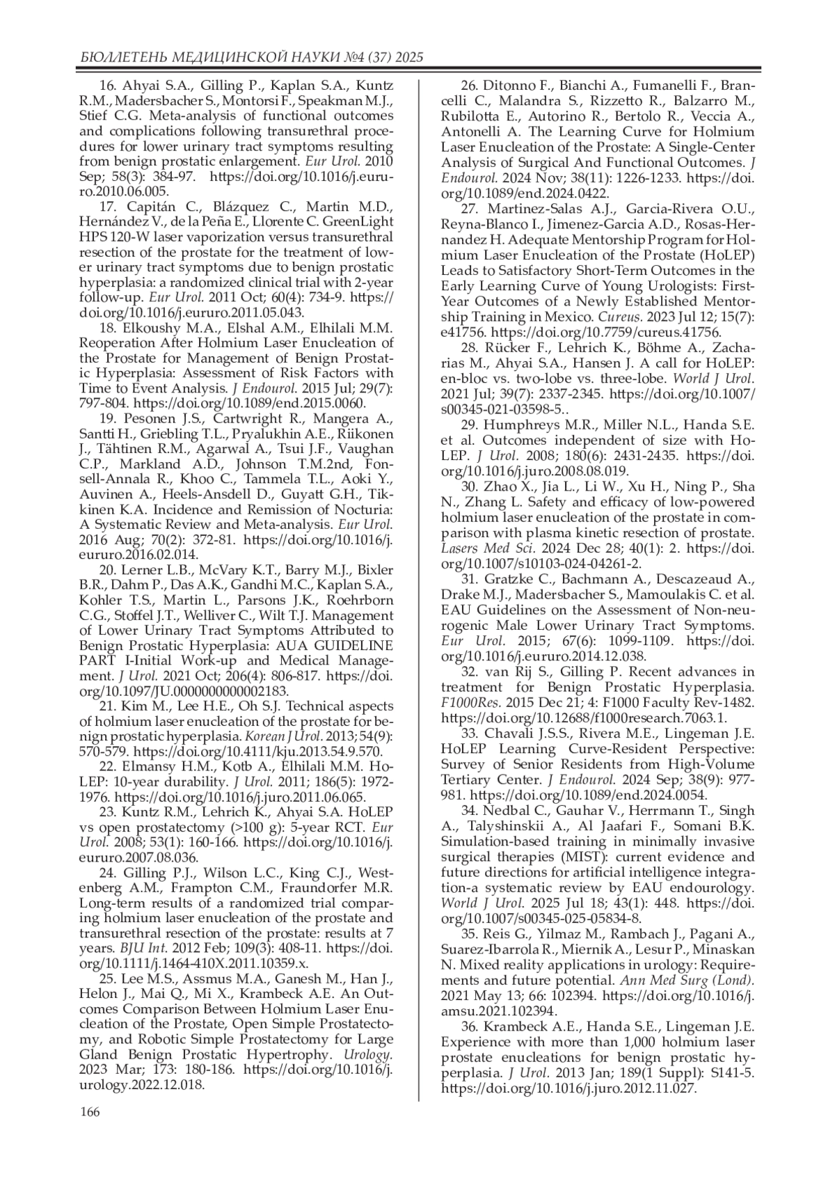 33. Chavali J.S.S., Rivera M.E., Lingeman J.E. HoLEP Learning Curve-Resident Perspective: Survey of Senior Residents from High-Volume Tertiary Center. J Endourol. 2024 Sep; 38(9): 977-981. DOI: 10.1089/end.2024.0054
