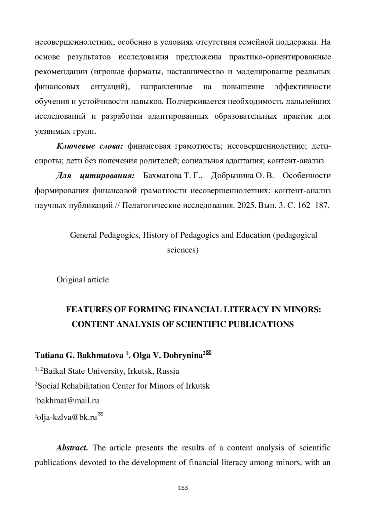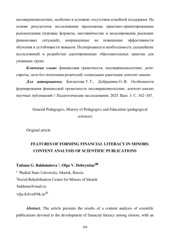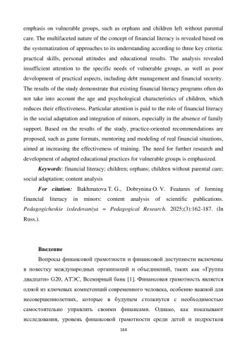 В статье представлены результаты контент-анализа научных публикаций, посвященных формированию финансовой грамотности среди несовершеннолетних с акцентом на уязвимые группы, такие как дети-сироты и дети, оставшиеся без попечения родителей. Раскрыта многогранность понятия финансовой грамотности на основе систематизации подходов к его пониманию по трем ключевым критериям: практические навыки, личностные установки и образовательные результаты. Анализ выявил недостаточное внимание к специфическим потребностям уязвимых групп, а также слабую проработку практических аспектов, включая управление долгами и финансовую безопасность в современных социально-экономических условиях. Результаты исследования демонстрируют, что существующие программы финансовой грамотности часто не учитывают возрастные и психологические особенности детей, что существенно снижает их эффективность. Особое внимание уделено роли финансовой грамотности в социальной адаптации и интеграции несовершеннолетних, особенно в условиях отсутствия семейной поддержки. На основе результатов исследования предложены практико-ориентированные рекомендации (игровые форматы, наставничество и моделирование реальных финансовых ситуаций), направленные на повышение эффективности обучения и устойчивости навыков. Подчеркивается необходимость дальнейших исследований и разработки адаптированных образовательных практик для уязвимых групп.