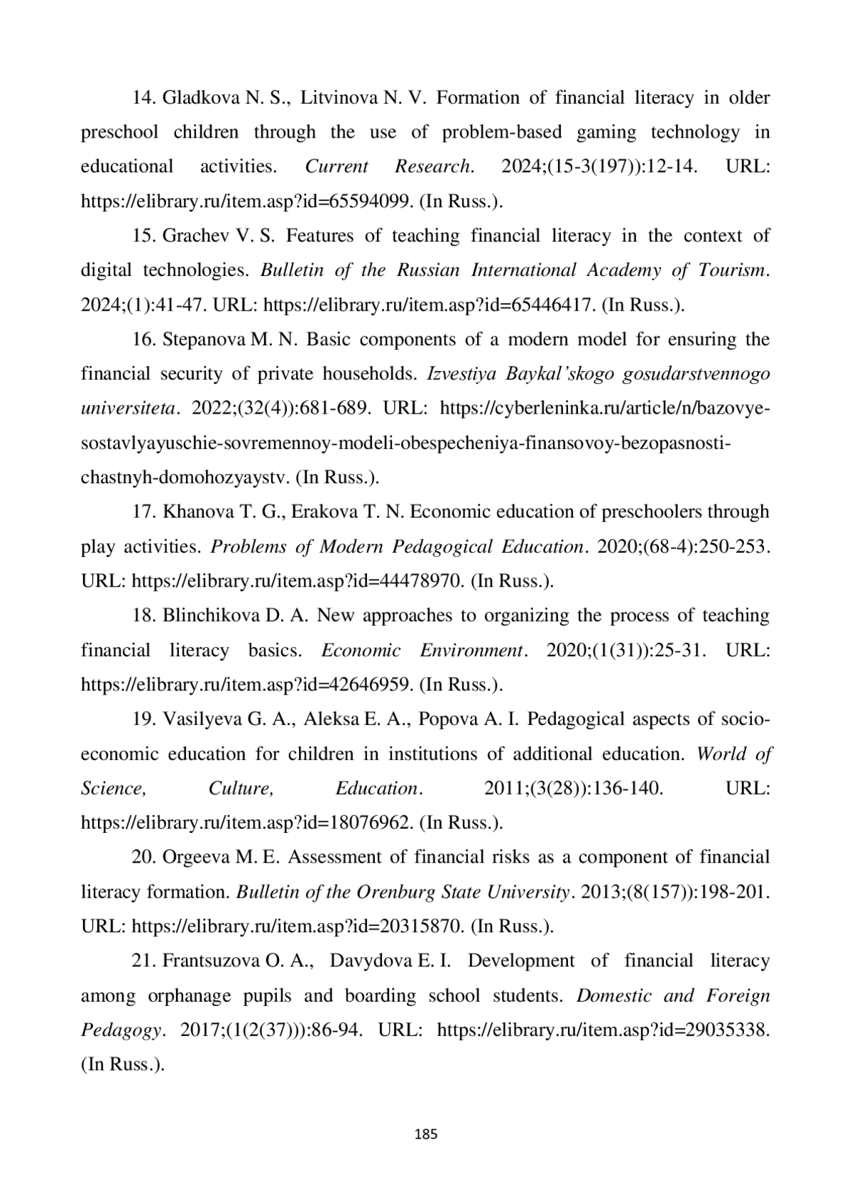 7. Кузнецова Н. А. Инновационные технологии формирования у детей основ финансово-экономической культуры: программа “Россия: баланс ценностей” // Правовая и финансовая грамотность: безопасность общественного развития: Сборник научных трудов Межрегиональной научно-практической конференции с международным участием, (15 декабря 2023 г.). Екатеринбург, 2023. С. 40-46. URL: item.asp?id=68589266. EDN: GIGGQL