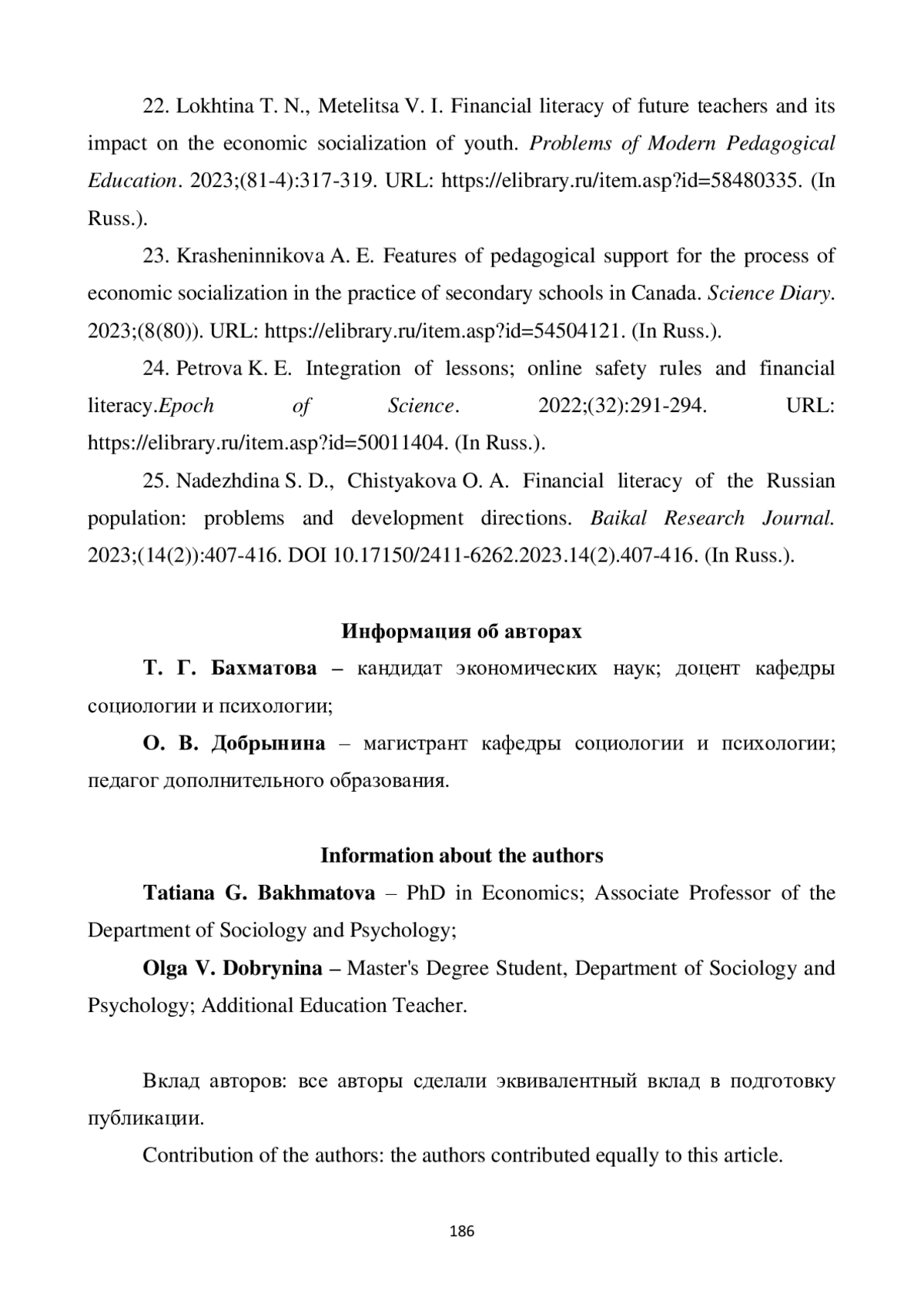 22. Лохтина Т. Н., Метелица В. И. Финансовая грамотность будущих педагогов и ее влияние на экономическую социализацию молодежи // Проблемы современного педагогического образования. 2023. № 81-4. С. 317-319. URL: item.asp?id=58480335. EDN: MZNJII