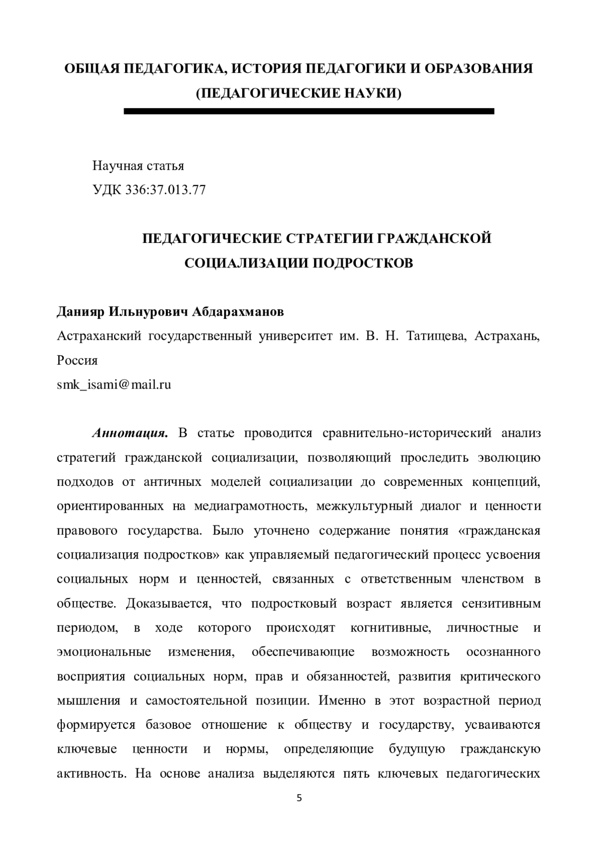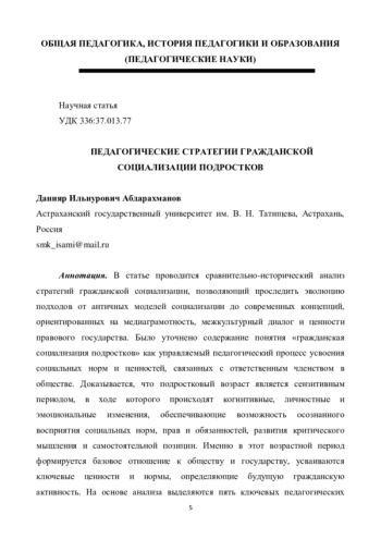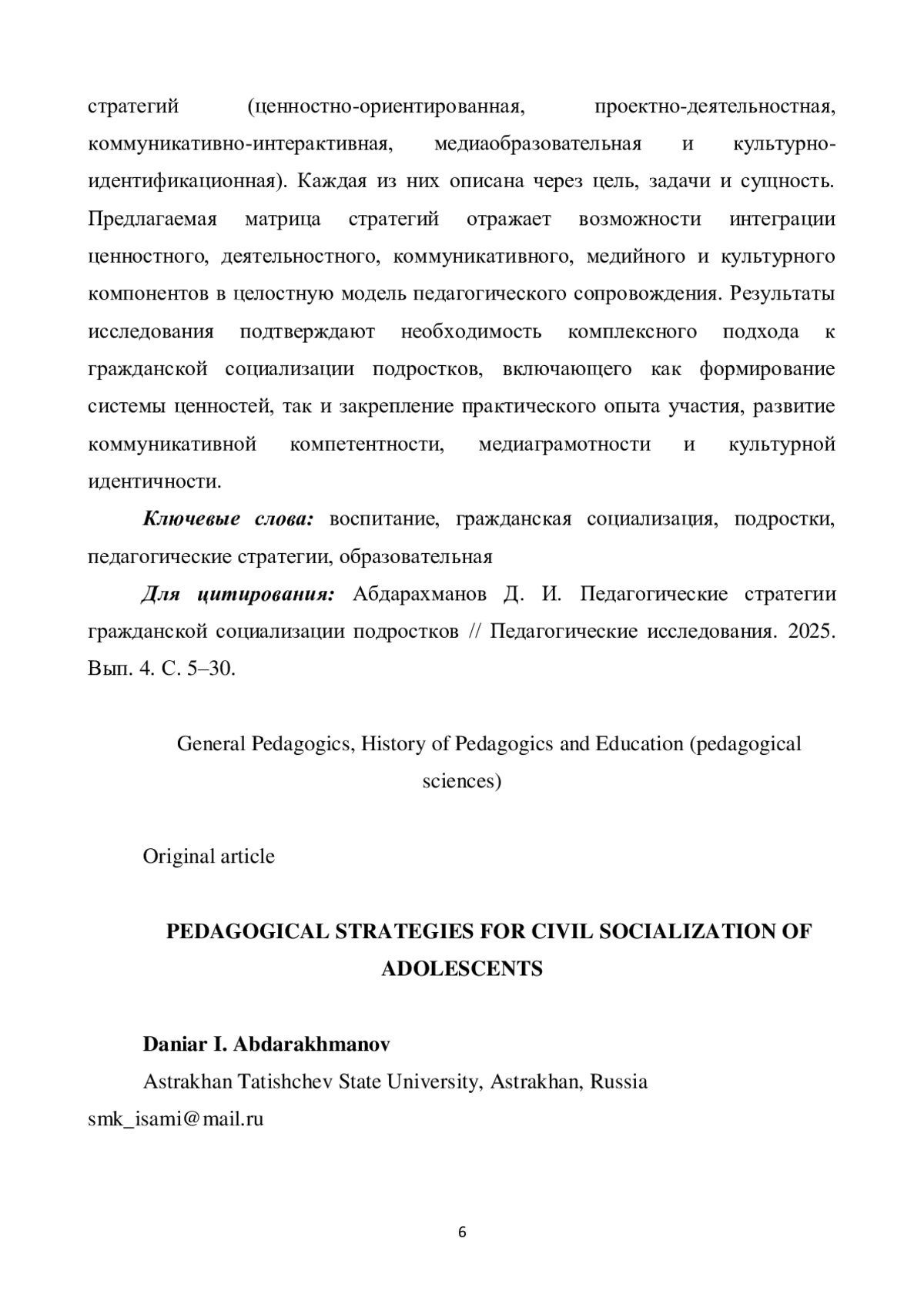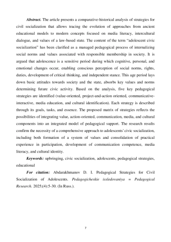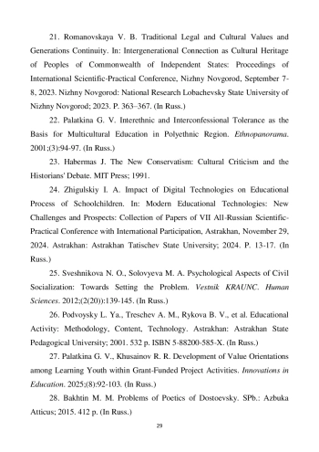 8. Палаткина Г. В., Джуманов Р. Г. Сущность гражданской социализации молодежи в образовательной среде // Педагогические исследования. 2025. Вып. 2. С. 170-193. EDN: FXGTGK