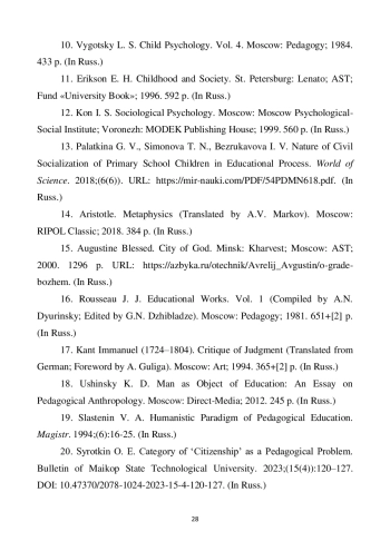 13. Палаткина Г. В., Симонова Т. Н., Безрукавова И. В. Сущность гражданской социализации младших школьников в образовательном процессе // Мир науки. 2018. Т. 6, № 6. URL: https://mir-nauki.com/PDF/54PDMN618.pdf. EDN: YYJBIL