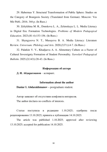 31. Шынгысова Н. Т., Мусаева Б. А. Медиаграмотность: обзор литературы // Universum: филология и искусствоведение. 2020. № 3 (71). С. 4-7. EDN: CYKOON