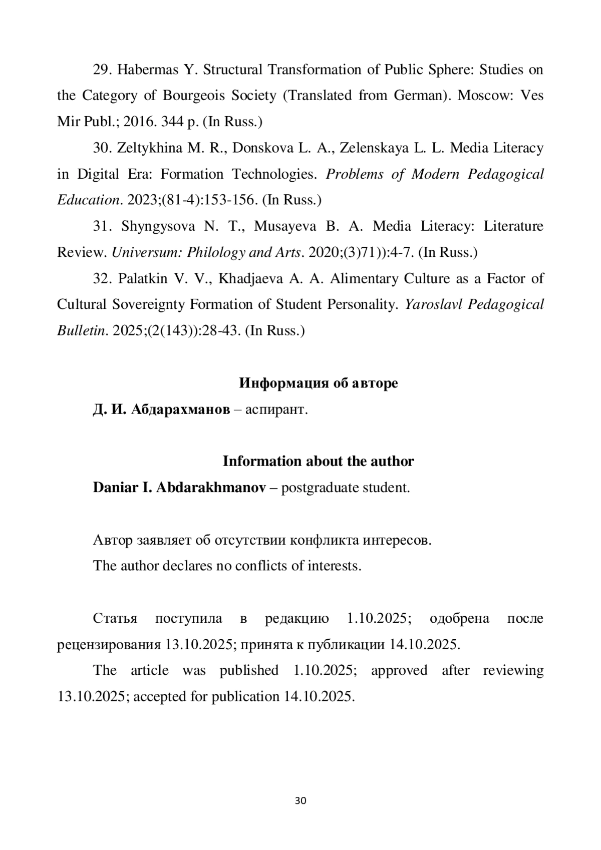 30. Желтухина М. Р., Донскова Л. А., Зеленская Л. Л. Медиаграмотность в цифровую эпоху: технологии формирования // Проблемы современного педагогического образования. 2023. № 81-4. С. 153-156. EDN: SDHEIV