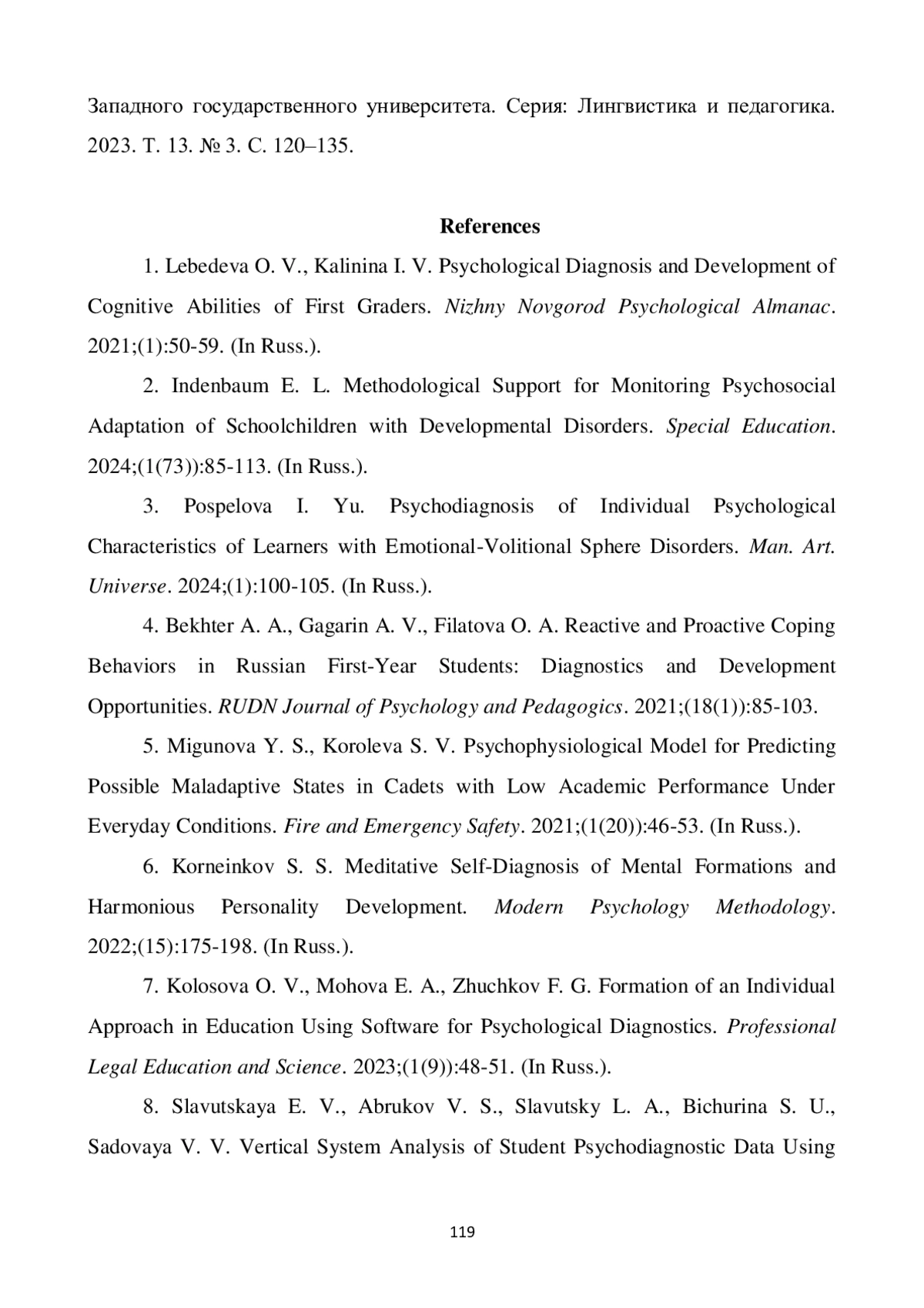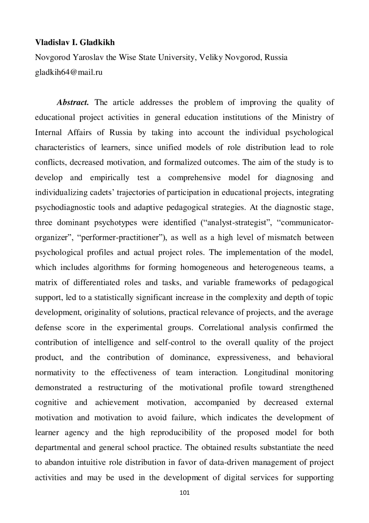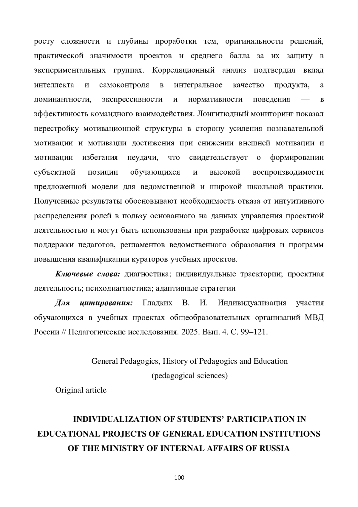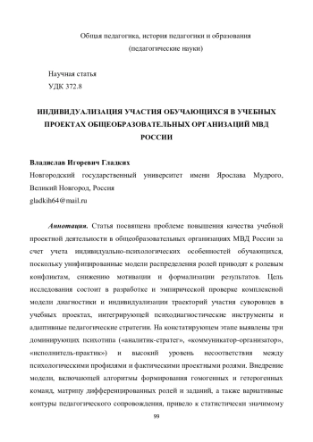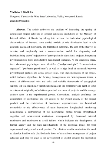 Статья посвящена проблеме повышения качества учебной проектной деятельности в общеобразовательных организациях МВД России за счет учета индивидуально-психологических особенностей обучающихся, поскольку унифицированные модели распределения ролей приводят к ролевым конфликтам, снижению мотивации и формализации результатов. Цель исследования состоит в разработке и эмпирической проверке комплексной модели диагностики и индивидуализации траекторий участия суворовцев в учебных проектах, интегрирующей психодиагностические инструменты и адаптивные педагогические стратегии. На констатирующем этапе выявлены три доминирующих психотипа («аналитик-стратег», «коммуникатор-организатор», «исполнитель-практик») и высокий уровень несоответствия между психологическими профилями и фактическими проектными ролями. Внедрение модели, включающей алгоритмы формирования гомогенных и гетерогенных команд, матрицу дифференцированных ролей и заданий, а также вариативные контуры педагогического сопровождения, привело к статистически значимому росту сложности и глубины проработки тем, оригинальности решений, практической значимости проектов и среднего балла за их защиту в экспериментальных группах. Корреляционный анализ подтвердил вклад интеллекта и самоконтроля в интегральное качество продукта, а доминантности, экспрессивности и нормативности поведения - в эффективность командного взаимодействия. Лонгитюдный мониторинг показал перестройку мотивационной структуры в сторону усиления познавательной мотивации и мотивации достижения при снижении внешней мотивации и мотивации избегания неудачи, что свидетельствует о формировании субъектной позиции обучающихся и высокой воспроизводимости предложенной модели для ведомственной и широкой школьной практики. Полученные результаты обосновывают необходимость отказа от интуитивного распределения ролей в пользу основанного на данных управления проектной деятельностью и могут быть использованы при разработке цифровых сервисов поддержки педагогов, регламентов ведомственного образования и программ повышения квалификации кураторов учебных проектов.