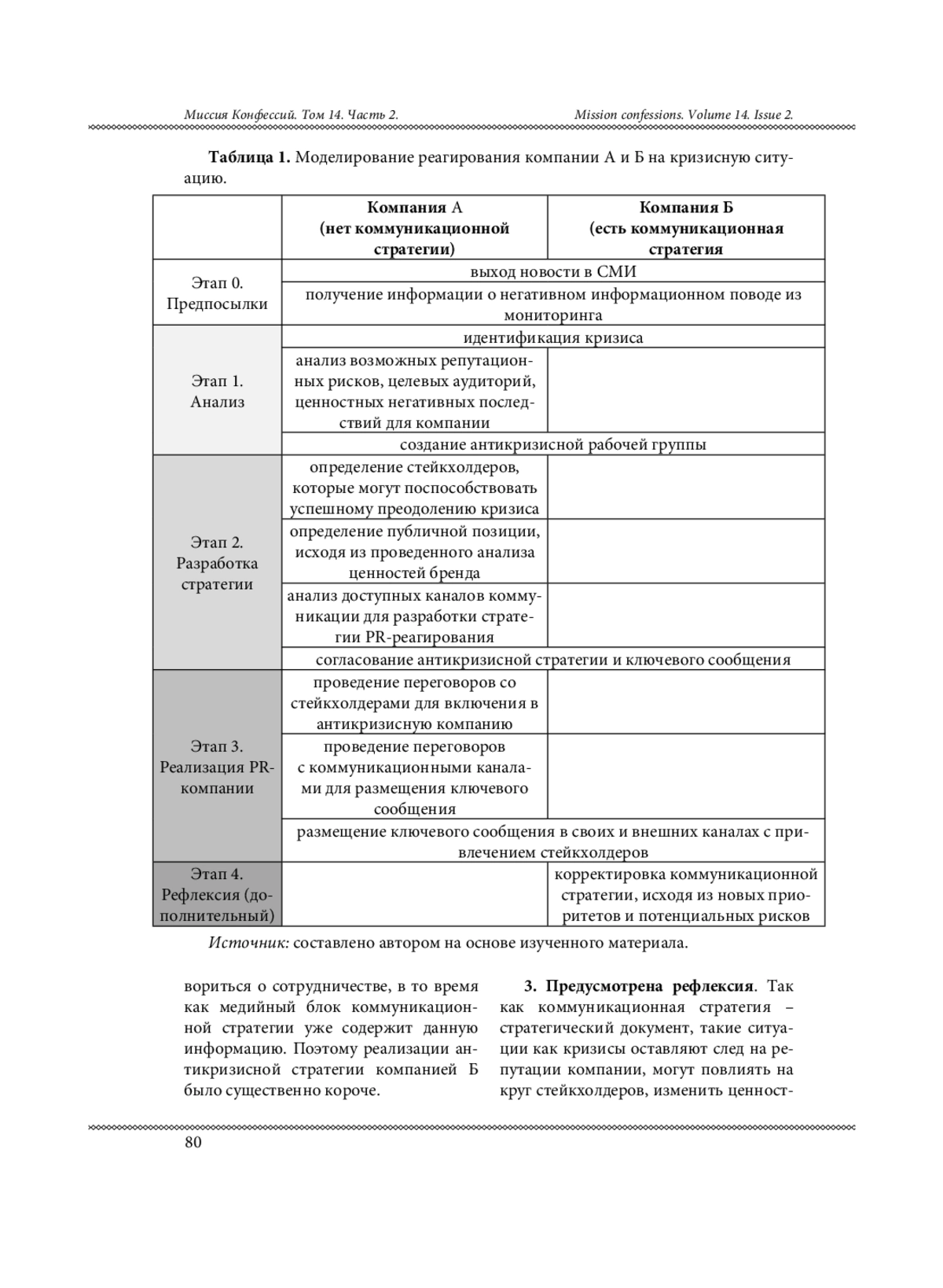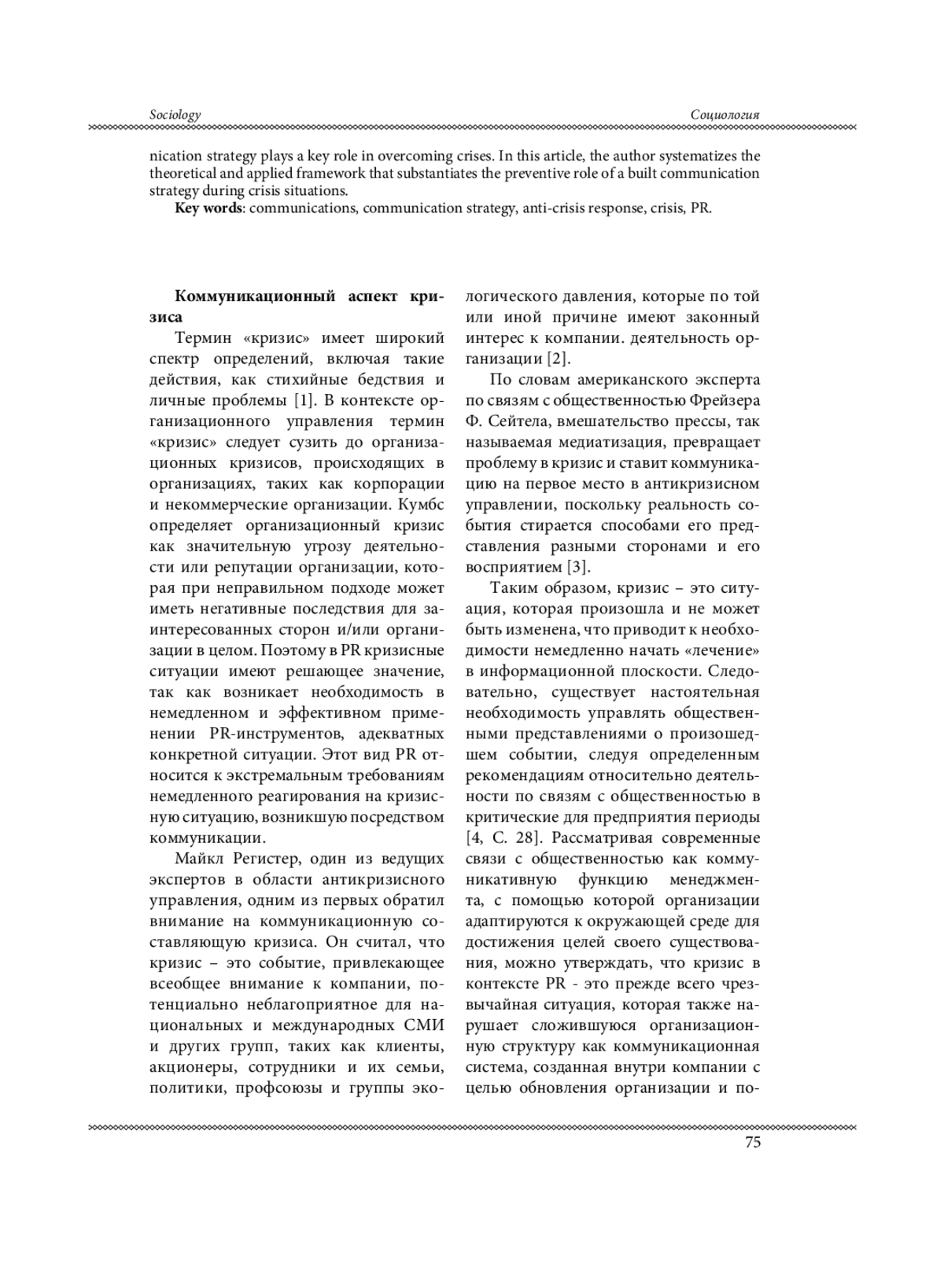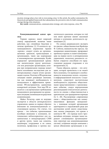 Современное общество переживает значительные социально-экономические трансформации, вызванные глобализацией, информатизацией и усилением роли массовых коммуникаций. В таких условиях PR становится важным инструментом управления общественным мнением и адаптации компаний к изменяющейся среде. Возрастающая конкуренция, снижение уровня контроля над информационными потоками, превалирование эмоциональной составляющей информационных поводов над фактологией ставит перед профессиональным сообществом новый вызов: минимизация возникновения кризисных ситуаций и снижение репутационного урона при реализации кризиса. Несмотря на наличие большого количества инструментов, направленных на преодоление кризисных ситуаций, автор полагает, что ключевую роль в преодолении кризисов играет коммуникационная стратегия. В данной статье автором систематизирована теоретическая и прикладная база, обосновывающая превентивную роль выстроенной коммуникационной стратегии во время кризисных ситуаций.