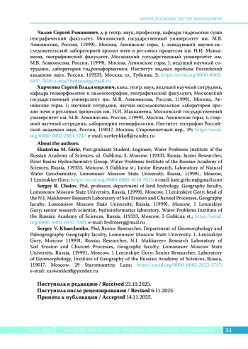 13. Chalov S., Platonov V., Erina O., Moreido V., Samokhin M., Sokolov D., Tereshina M., Yarinich Y., Kasimov, N. Rainstorms impacts on water, sediment, and trace elements loads in an urbanized catchment within Moscow city: case study of summer 2020 and 2021 // Theoretical and Applied Climatology. 2023. Vol. 151. P. 871-889. DOI: 10.1007/s00704-022-04298-9
