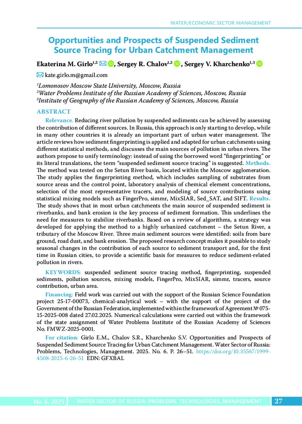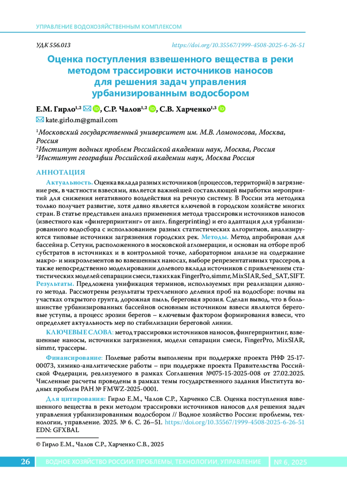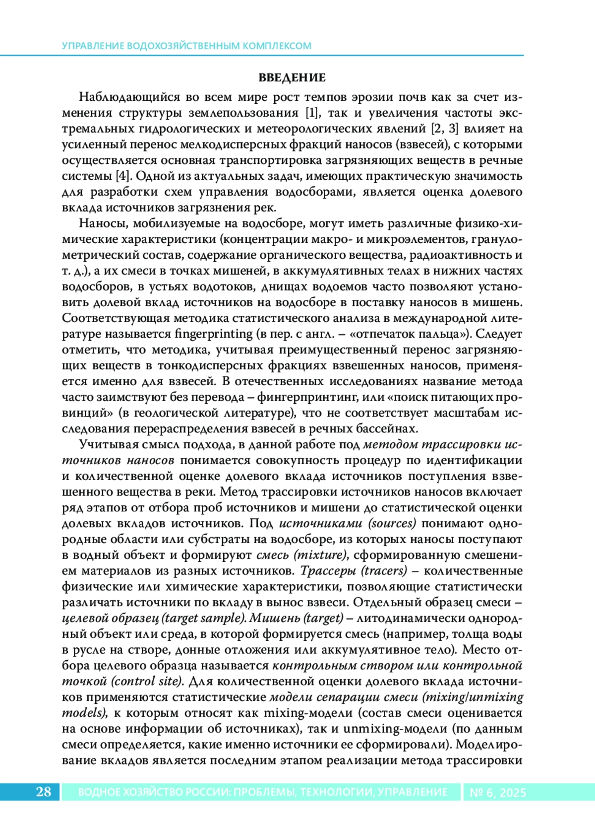 Наблюдающийся во всем мире рост темпов эрозии почв как за счет изменения структуры землепользования [1], так и увеличения частоты экстремальных гидрологических и метеорологических явлений [2, 3] влияет на усиленный перенос мелкодисперсных фракций наносов (взвесей), с которыми осуществляется основная транспортировка загрязняющих веществ в речные системы [4]. Одной из актуальных задач, имеющих практическую значимость для разработки схем управления водосборами, является оценка долевого вклада источников загрязнения рек.