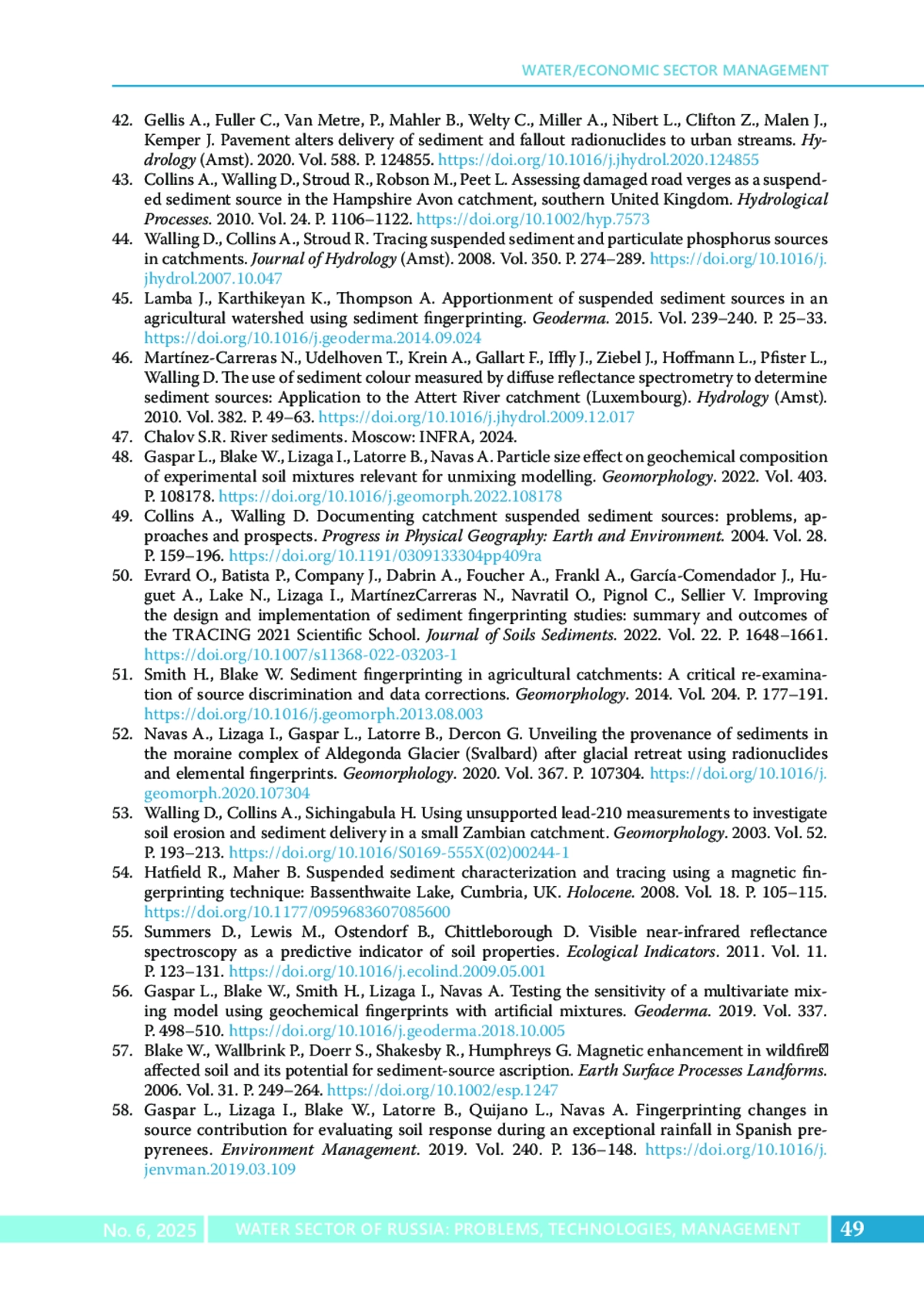 5. Collins A., Blackwell M., Boeckx P., Chivers C., Emelko M., Evrard O., Foster I., Gellis A., Gholami H., Granger S., Harris P., Horowitz A., Laceby J., Martinez-Carreras N., Minella J., Mol L., Nosrati K., Pulley S., Silins U., da Silva Y., Stone M., Tiecher T., Upadhayay H., Zhang Y. Sediment source fingerprinting: benchmarking recent outputs, remaining challenges and emerging themes // Journal of Soils Sediments. 2020. Vol. 20. P. 4160-4193. DOI: 10.1007/sll368-020-02755-4