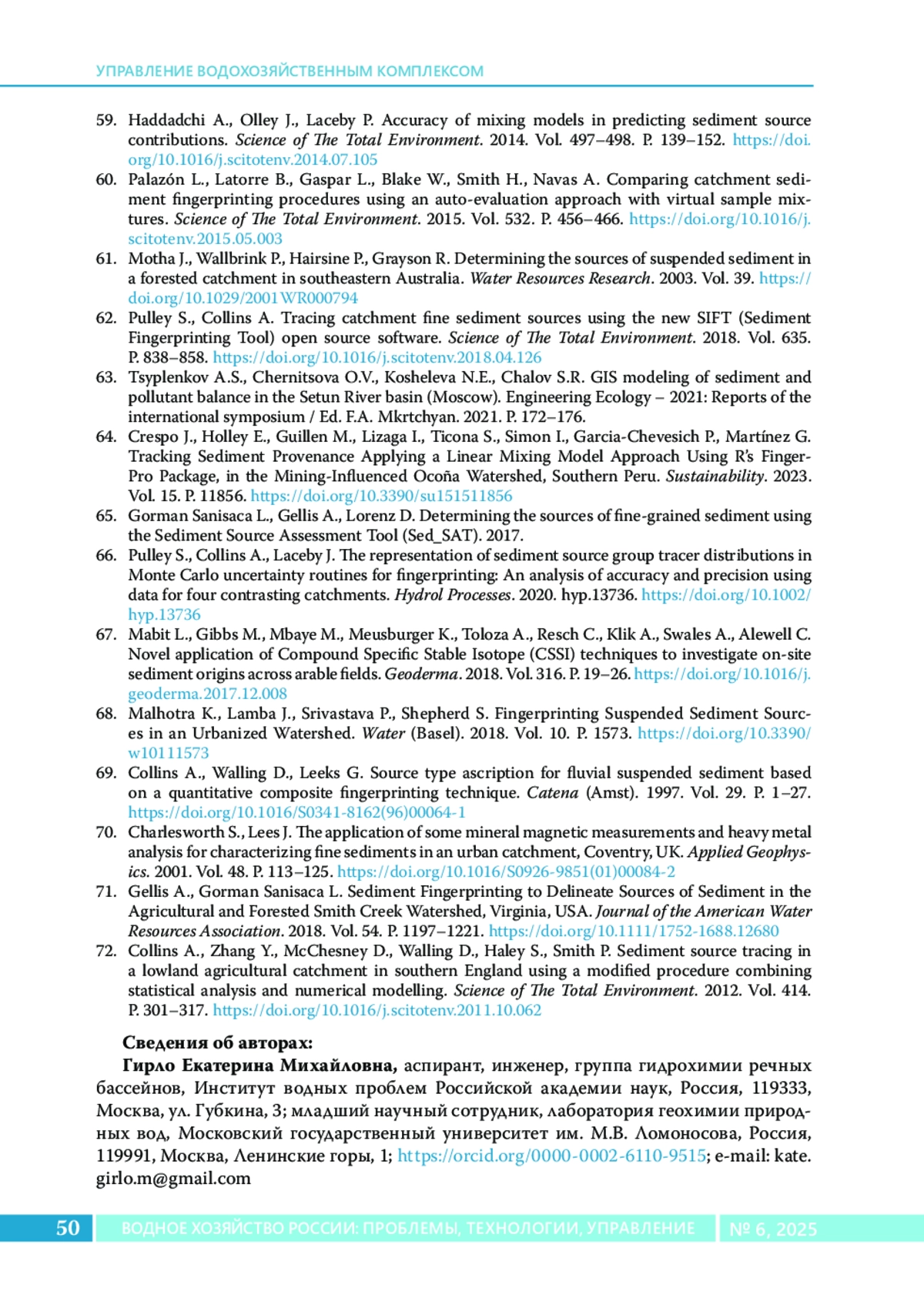 59. Haddadchi A., Olley J., Laceby P. Accuracy of mixing models in predicting sediment source contributions // Science of The Total Environment. 2014. Vol. 497-498. P. 139-152. DOI: 10.1016/j.scitotenv.2014.07.105