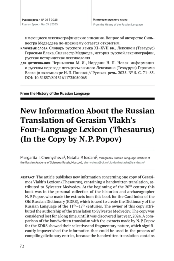 В статье публикуются новые данные, касающиеся рукописного перевода на русский язык (к. XVII в.), которые находятся в одном из сохранившихся экземпляров Лексикона (Тезауруса) Герасима Влаха. В начале XX в. эта книга была в личной коллекции историка и археографа Н. П. Попова, делавшего выписки из этого источника для Картотеки Древнерусского словаря (КДРС), на материале которой составляется Словарь русского языка XI–XVII вв. Авторство перевода приписывалось владельцем этого экземпляра Сильвестру Медведеву. Экземпляр, считавшийся утраченным, был обнаружен в прошлом, 2024 году. Сравнение рукописного перевода с выписками, сделанными Н. П. Поповым для КДРС, показало их выборочный и фрагментарный характер, что существенно обедняло информацию, которая могла быть использована при составлении словарных статей, поскольку рукописный перевод содержит гораздо более значительный лексический материал по сравнению со сверхкраткими выписками, сделанными расписчиком для Картотеки. Обнаружение полного рукописного перевода дает возможность по-новому оценить язык перевода, показать богатство его лексического материала, дополнить, а в некоторых случаях и пересмотреть имеющиеся лексикографические описания. Вопрос об авторстве Сильвестра Медведева по-прежнему остается открытым