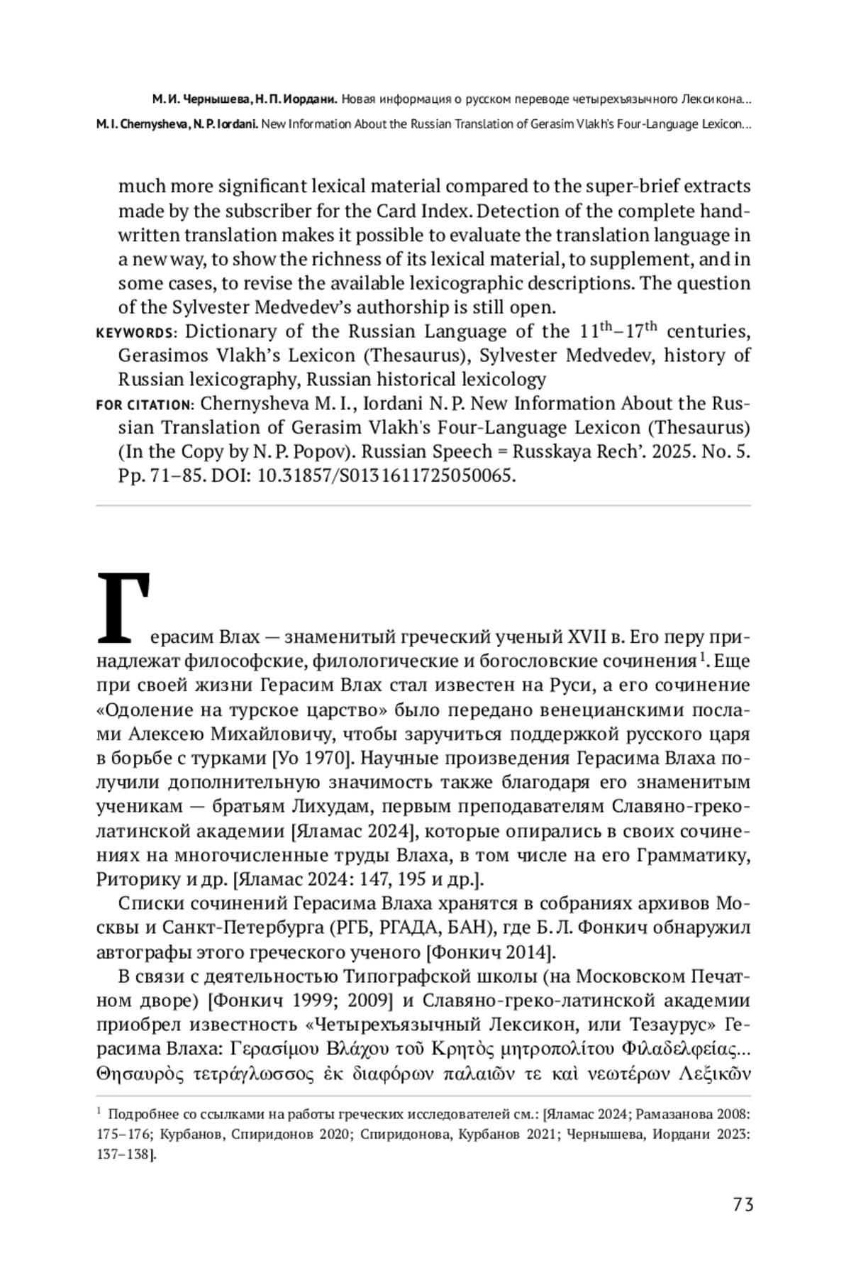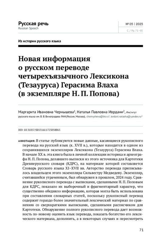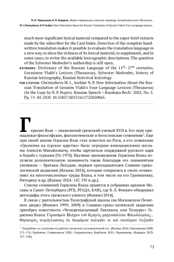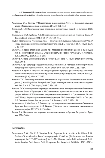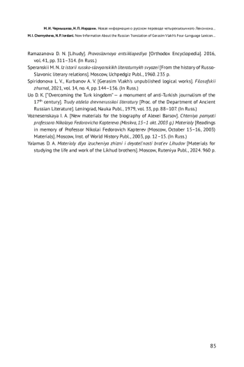 20. Чернышева М. И., Иордани Н. П. Лексика русского перевода четырехъязычного Лексикона Герасима Влаха и доклад Н. П. Попова // Славянская историческая лексикология и лексикография. 2023. Т. 6. С. 134-164. EDN: PJMCIX