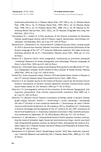 19. Ховрина Т. К. Славяно-русские переводы иноязычных слов в четырехъязычном Лексиконе Герасима Влаха // Традиции И. И. Срезневского в русской лексикологии и лексикографии XXI века. К 210-летию со дня рождения академика И. И. Срезневского. Сб. статей V Межд. Научно-практической конференции 26-28 сентября 2022 г. / Отв. ред. Е. П. Осипова. Рязань: Ряз. гос. ун-т им. С. А. Есенина, 2022. С. 127-131. EDN: TWAVKK