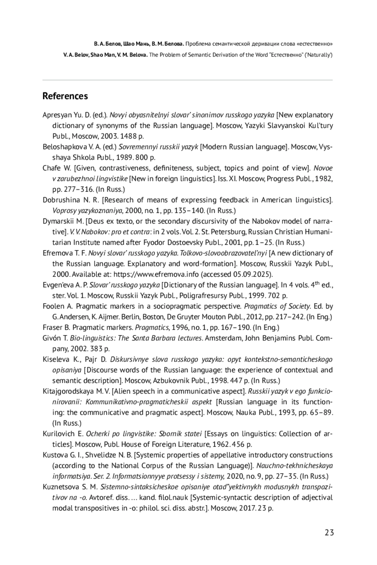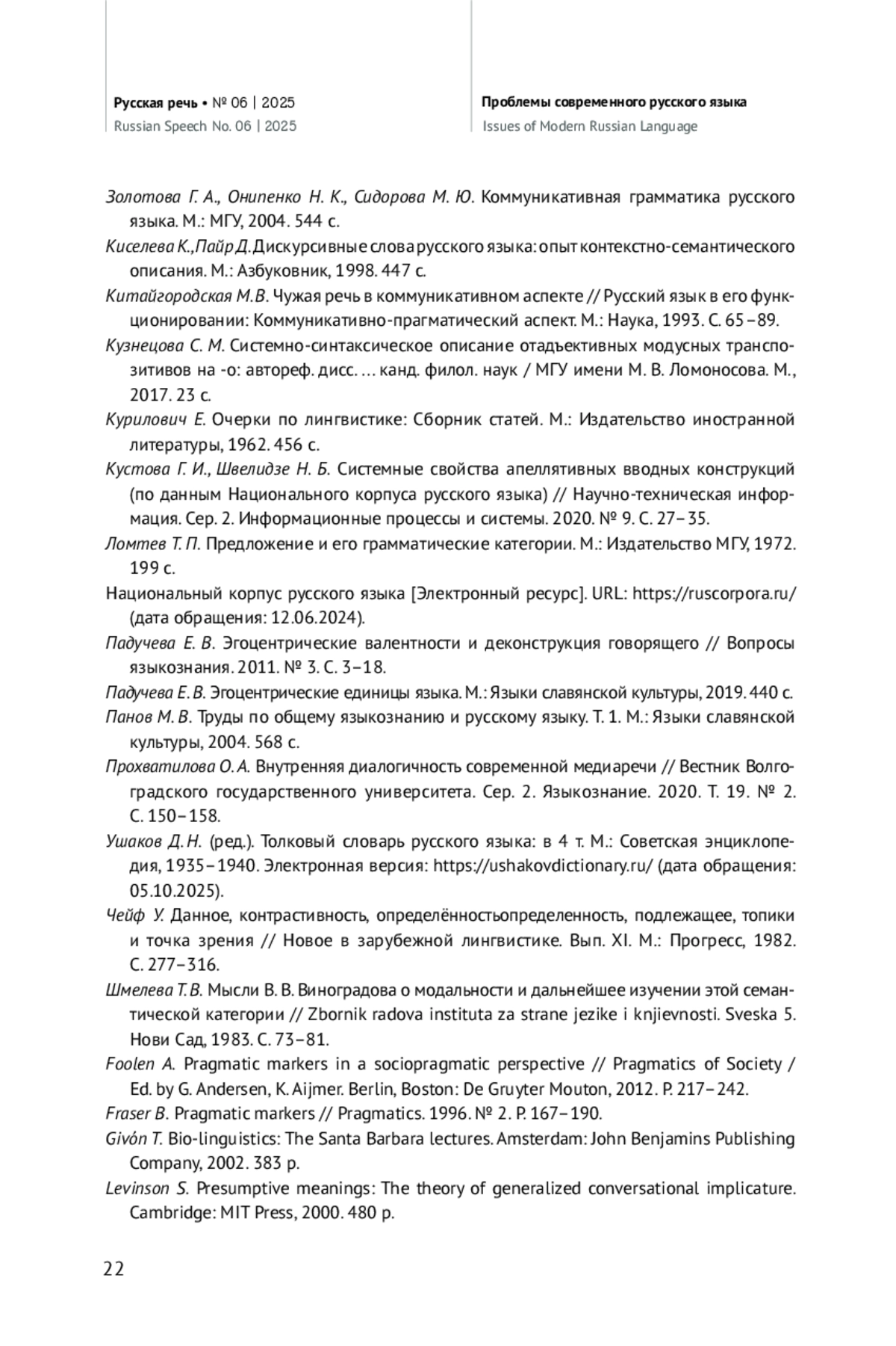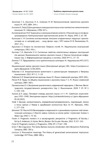 4. Добрушина Н. Р. Исследования средств выражения обратной связи в американской лингвистике // Вопросы языкознания. 2000. № 1. С. 135-140.