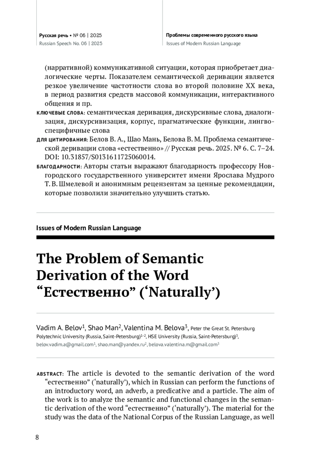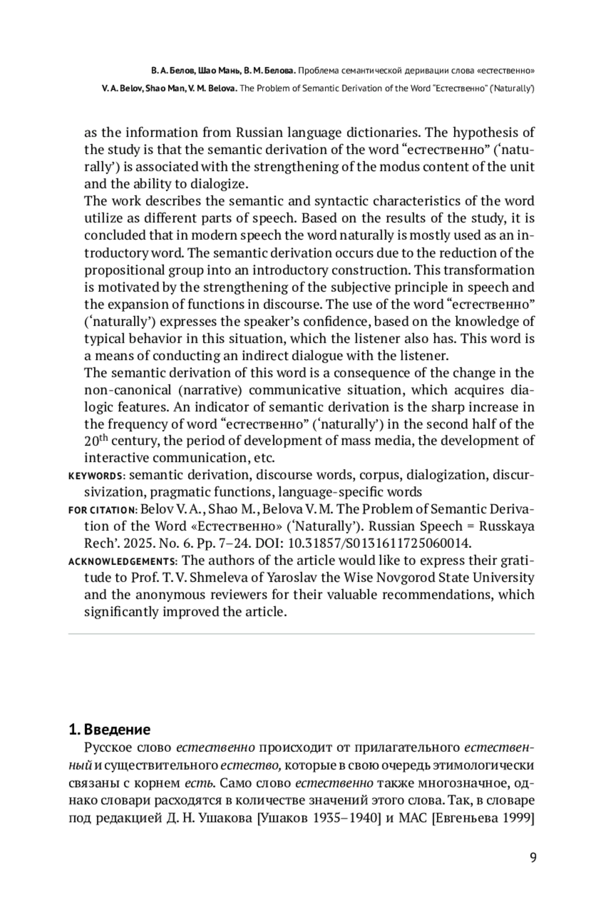 Статья посвящена семантической деривации слова «естественно», которое в русском языке может выполнять функции вводного слова, наречия, прилагательного, предикатива и частицы. Целью работы является анализ семантических и функциональных изменений при семантической деривации слова «естественно». Материалом исследования послужили данные Национального корпуса русского языка, а также сведения словарей русского языка. Гипотезой исследования является положение, что семантическая деривация слова «естественно» связана с усилением модусного содержания единицы и способности к диалогизации. В работе описаны семантические и синтаксические характеристики употребления слова в функции каждой части речи. По результатам исследования делается вывод, что в современной речи подавляющее большинство употреблений приходится на вводное слово. Семантическая деривация происходит за счет редукции пропозициональной группы в вводную конструкцию. Данная трансформация мотивирована усилением субъективного начала в речи и расширением функций в дискурсе. Употребление слова «естественно» выражает уверенность говорящего, основанную на знании типичного поведения в этой ситуации, которое также есть у слушателя. Данное слово является средством ведения непрямого диалога со слушателем. Семантическая деривация этого слова является следствием изменения неканонической (нарративной) коммуникативной ситуации, которая приобретает диалогические черты. Показателем семантической деривации является резкое увеличение частотности слова во второй половине XX века, в период развития средств массовой коммуникации, интерактивного общения и пр.