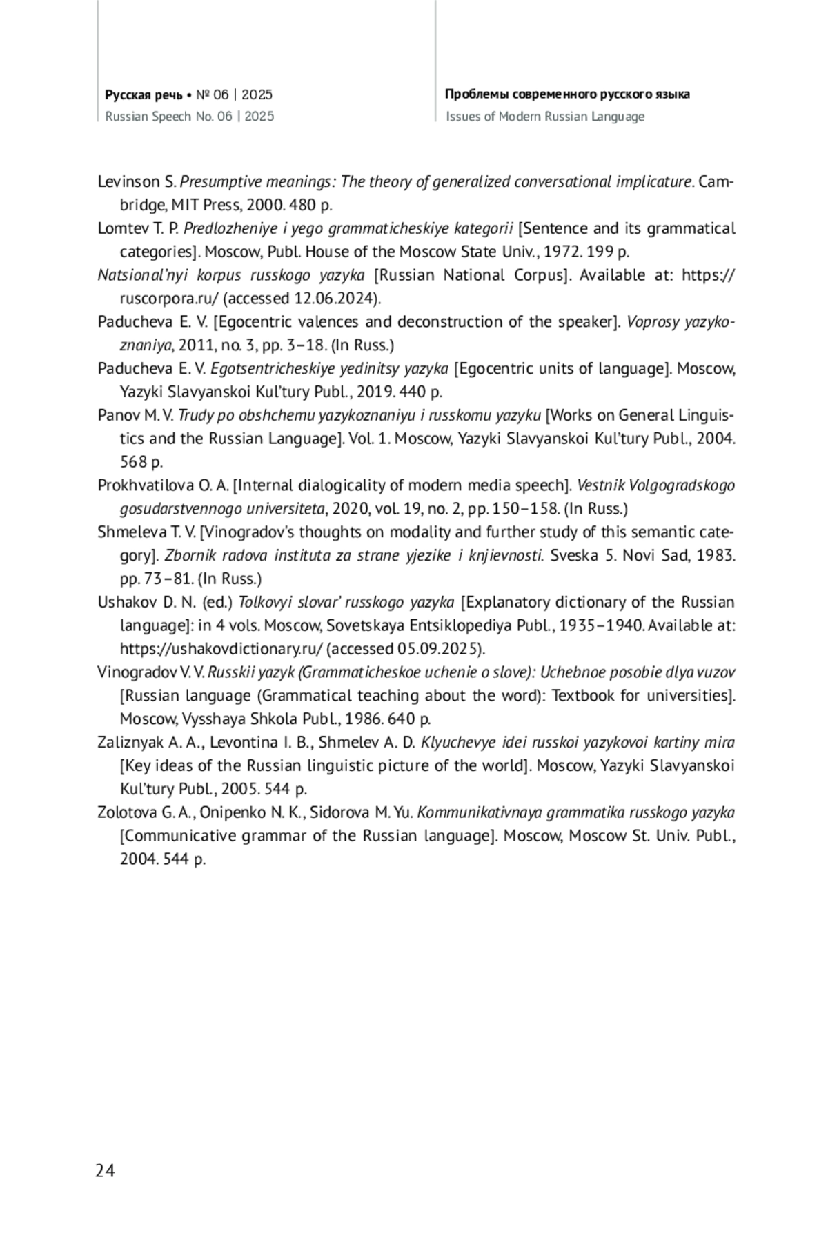 23. Шмелева Т. В. Мысли В. В. Виноградова о модальности и дальнейшее изучении этой семантической категории // Zbornik radova instituta za strane jezike i knjievnosti. Sveska 5. Нови Сад, 1983. С. 73-81.