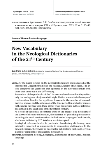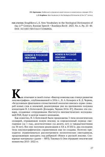 Как известно, Н. З. Котеловой были предложены 3 типа неологических словарей, отражающих новую лексику за определенный период: ежегодники (за 1 год), десятилетники (за десять лет) и тридцатилетники (за 30 лет). Все они получили реализацию в ХХ в. В XXI в. два последних типа лексикографических справочников еще не созданы. Поэтому приходится ограничиваться рассмотрением неологических ежегодников, продолжающих выходить под рубрикой «Новое в русской лексике. Словарные материалы» (далее — НРЛ). Таковых 8. Они отражают лексические новшества 2015–2022 гг.