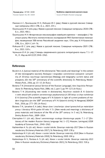 20. Павлова А. С., Приемышева М. Н., Ридецкая Ю. С. (ред.). Новое в русской лексике. Словарные материалы-2022. СПб., Б. и., 2023. 254 с.