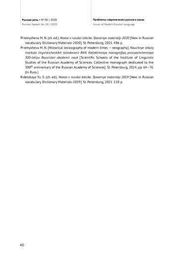 23. Ридецкая Ю. С. (отв. ред.). Новое в русской лексике. Словарные материалы-2019. СПб.: Б. и., 2021. 110 c.