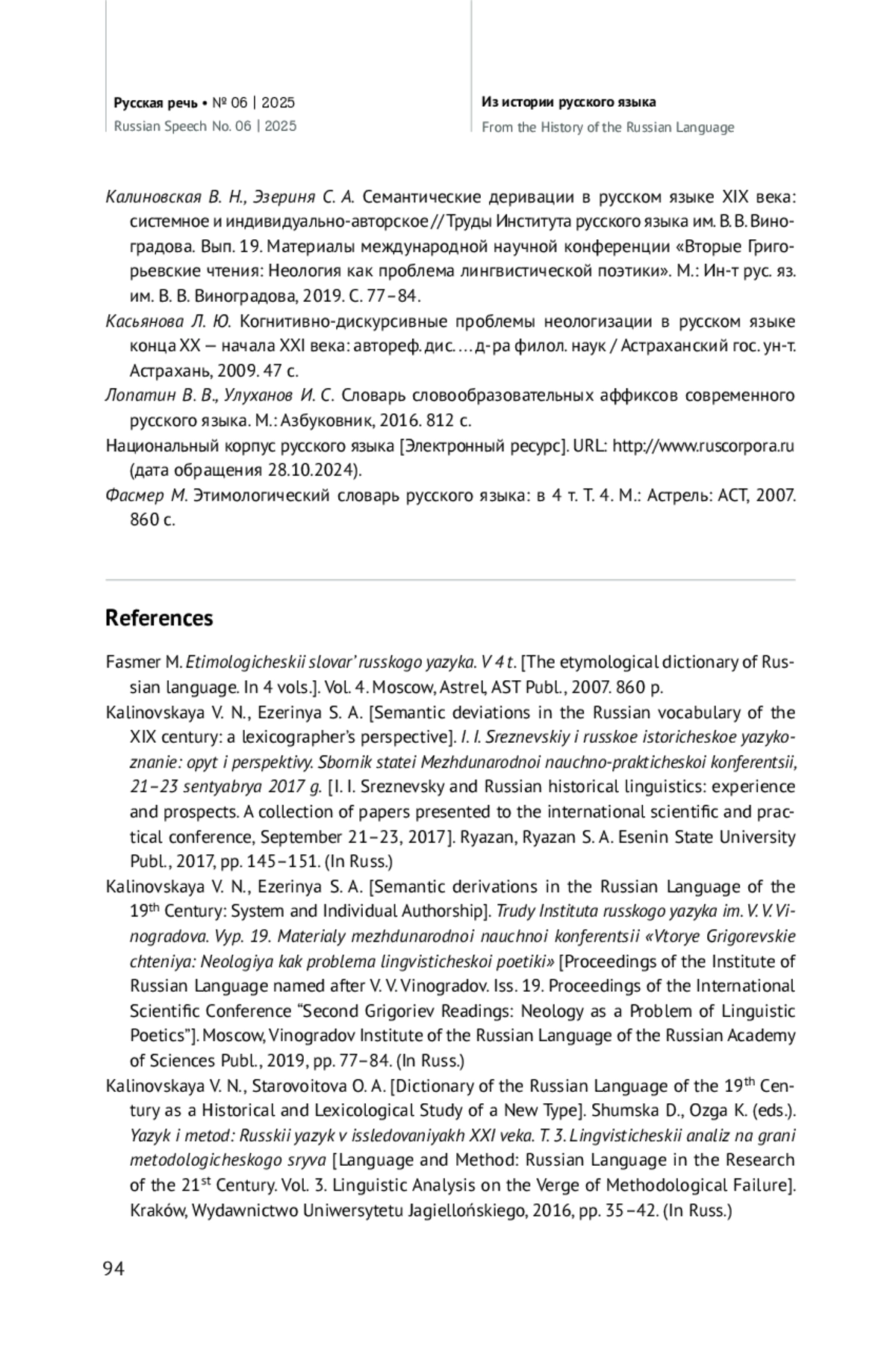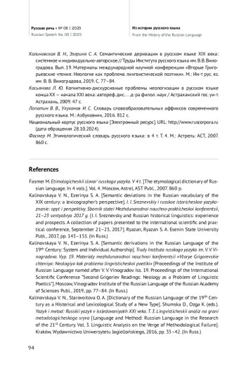 23. Калиновская В. Н., Эзериня С. А. Семантические деривации в русском языке XIX века: системное и индивидуально-авторское // Труды Института русского языка им. В. В. Виноградова. Вып. 19. Материалы международной научной конференции “Вторые Григорьевские чтения: Неология как проблема лингвистической поэтики”. М.: Ин-т рус. яз. им. В. В. Виноградова, 2019. С. 77-84. EDN: RNUGRN