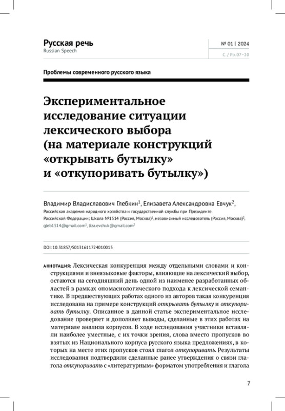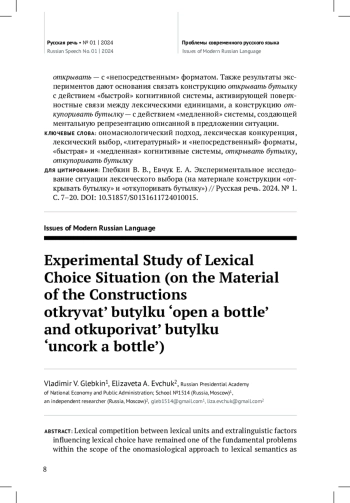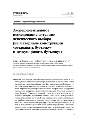 Лексическая конкуренция между отдельными словами и конструкциями и внеязыковые факторы, влияющие на лексический выбор, остаются на сегодняшний день одной из наименее разработанных областей в рамках ономасиологического подхода к лексической семантике. В предшествующих работах одного из авторов такая конкуренция исследована на примере конструкций открывать бутылку и откупоривать бутылку. Описанное в данной статье экспериментальное исследование проверяет и дополняет выводы, сделанные в этих работах на материале анализа корпусов. В ходе исследования участники вставляли наиболее уместные, с их точки зрения, слова вместо пропусков во взятых из Национального корпуса русского языка предложениях, в которых на месте этих пропусков стоял глагол откупоривать. Результаты исследования подтвердили сделанные ранее утверждения о связи глагола откупоривать с «литературным» форматом употребления и глагола открывать — с «непосредственным» форматом. Также результаты экспериментов дают основания связать конструкцию открывать бутылку с действием «быстрой» когнитивной системы, активирующей поверхностные связи между лексическими единицами, а конструкцию откупоривать бутылку — с действием «медленной» системы, создающей ментальную репрезентацию описанной в предложении ситуации