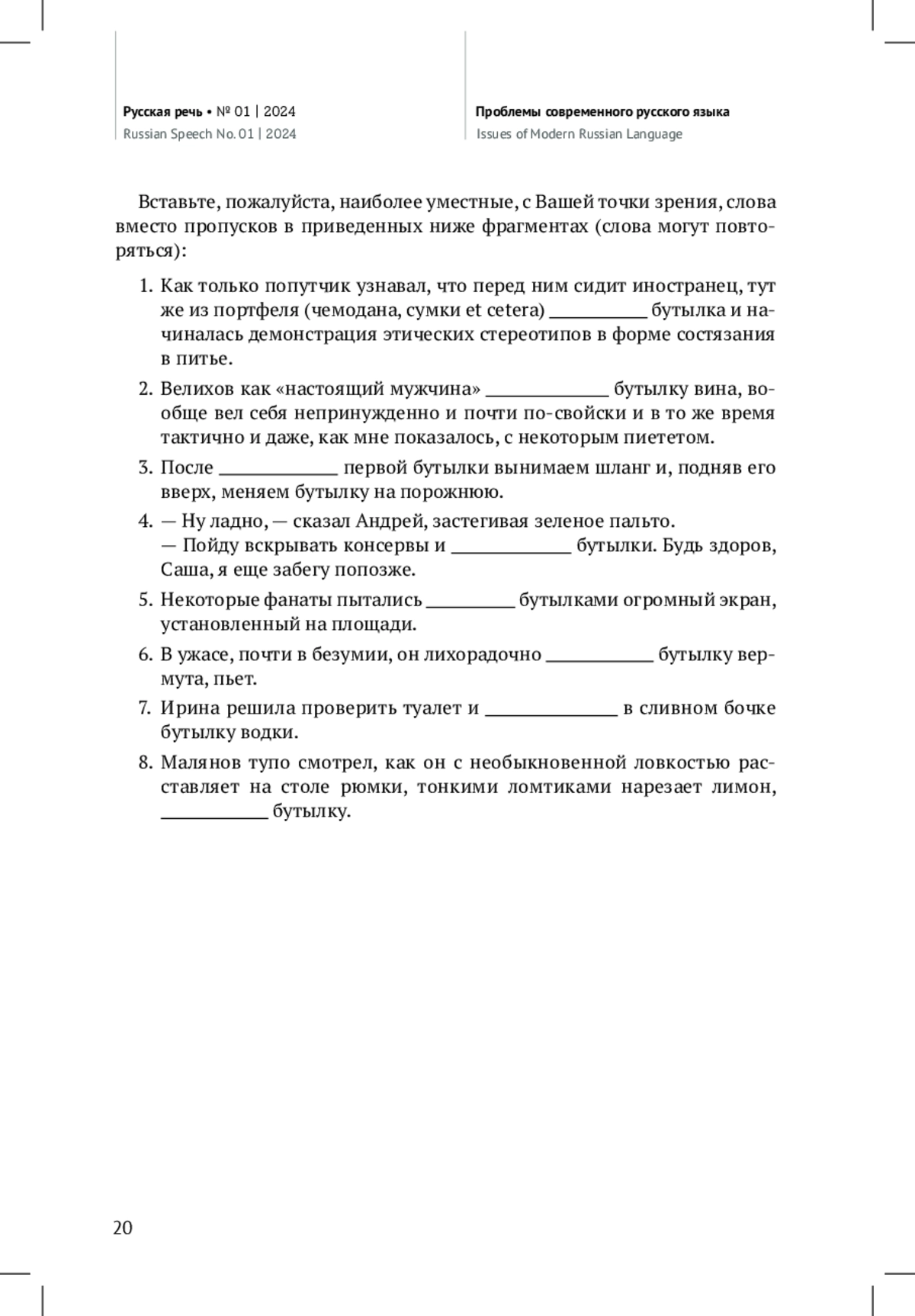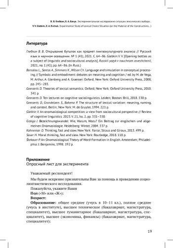 1. Глебкин В. В. Открывание бутылок как предмет лингвокультурного анализа // Русский язык в научном освещении. № 1 (41), 2021. С. 64-86. Glebkin V. V. [Opening bottles as a subject of linguistic and sociocultural analysis].Russkii yazyk v nauchnom osveshchenii, 2021, no. 1 (41), pp. 64-86. (In Russ.). EDN: YAKMVP