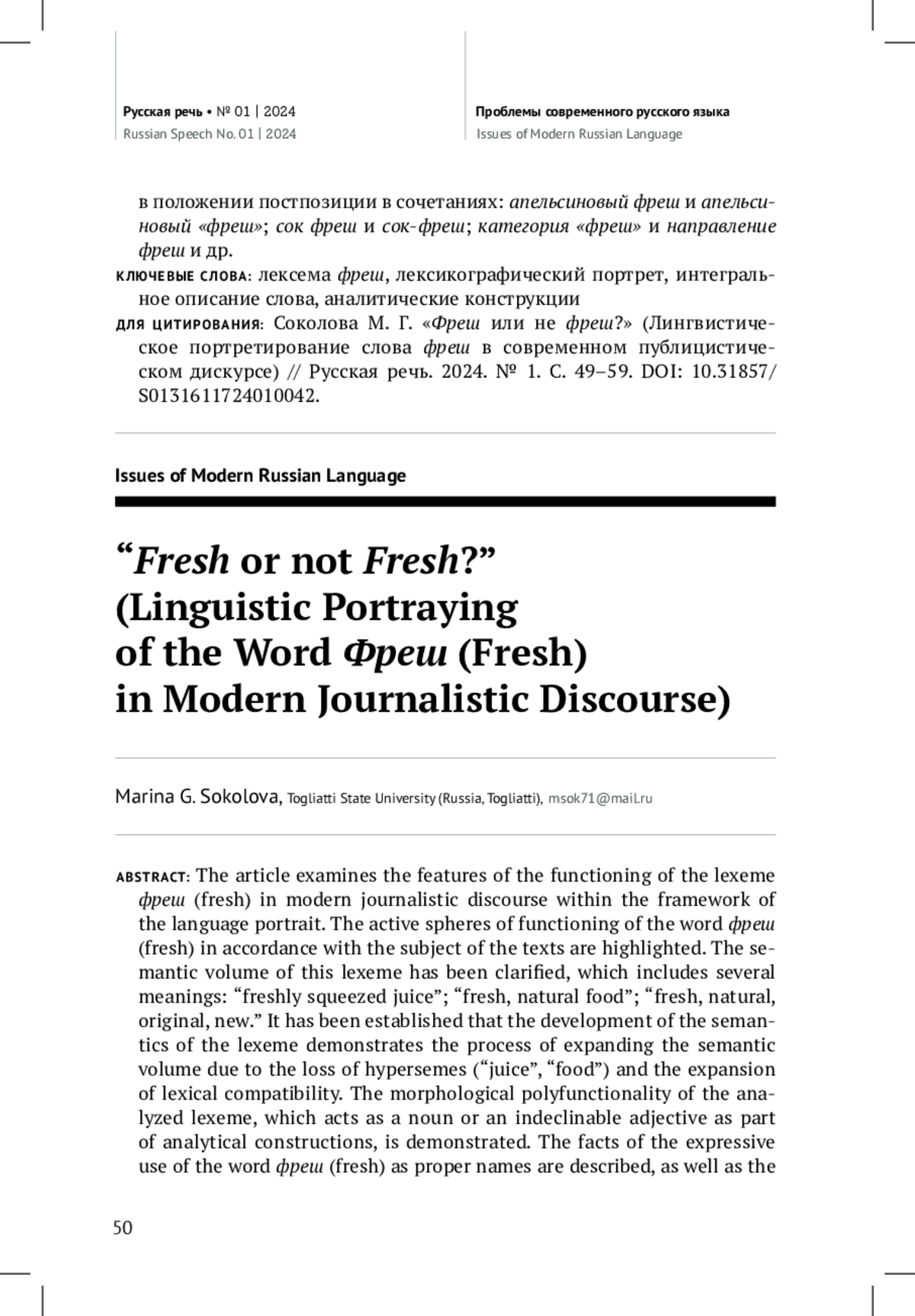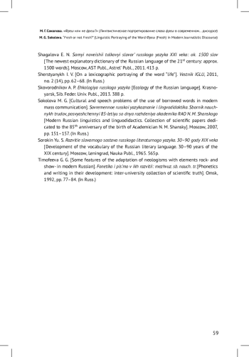 14. Соколова М. Г. Культурно-речевые проблемы употребления заимствованных слов в современной массовой коммуникации // Современное русской языкознание и лингводидактика. Сборник научных трудов, посвященный 85-летию со дня рождения академика РАО Н. М. Шанского / Ред. Л. Ф. Копосов, И. В. Шамшин, В. В. Никульцева, Е. Г. Хромова. М.: Изд-во МГОУ, 2007. С. 151-157. EDN: USVDXT