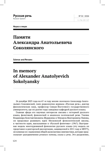 26 декабря 2023 года на 67-м году жизни скончался Александр Анатольевич Соколянский, член редколлегии журнала «Русская речь», доктор филологических наук, профессор Северо-Восточного государственного университета, где он долгие годы заведовал кафедрой русского языка.