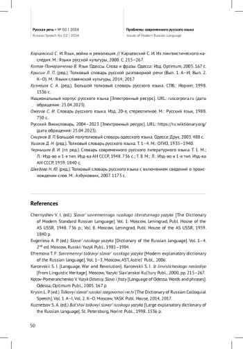 7. Крысин Л. П. (ред.). Толковый словарь русской разговорной речи (Вып. 1. A-И; Вып. 2. К-О). М.: Языки славянской культуры, 2014; 2017.