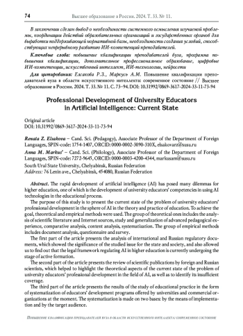 19. Бочкарёв П.В., Гусева А.И., Киреев С.В. Опыт реализации программы повышения квалификации по использованию искусственного интеллекта в образовании в исследовательском университете // Интеллектуальные технологии в науке и образовании. Новочеркасск: ООО “Лик”, 2023. С. 87-92. EDN: QDWFKI